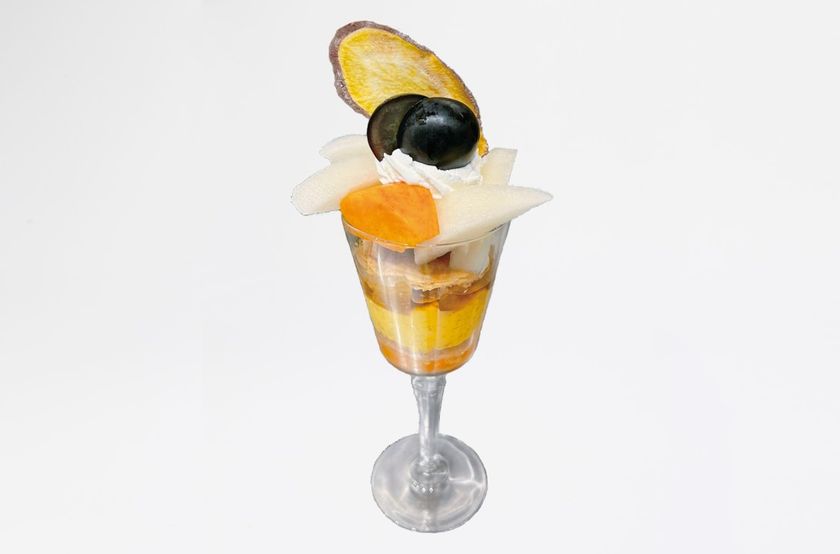 サクサク香ばしいパイ生地に、濃厚なかぼちゃプリンを重ねました。中には素材の風味を生かした紫芋とさつまいものアイスを忍ばせ、ジューシーなぶどう、みずみずしい梨、甘みあふれる柿を組み合わせて秋の果実を贅沢に。トップには自家製のさつまいもチップスを添え、香ばしさと遊び心をプラスしました。一口ごとに移り変わる食感と彩りを楽しめる、秋ならではのごちそうパフェです。