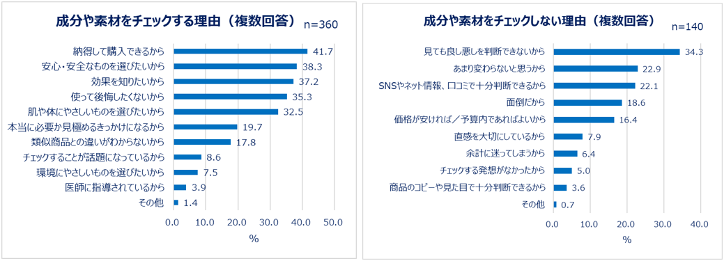 成分や素材をチェックする理由は「納得して購入できるから(41.7%)」が1位に。自分なりに納得感を持って購入したいという人は多いのかもしれません。成分や素材をチェックしない人にもその理由を聞いたところ、1位は「見ても良し悪しを判断できないから(34.3%)」でした。細かい成分や素材まで見ずとも「SNSやネット情報、口コミで十分判断できるから(22.1%)」という人も約2割おり、一部の人は他者目線での情報も活用して買い物しているようです。