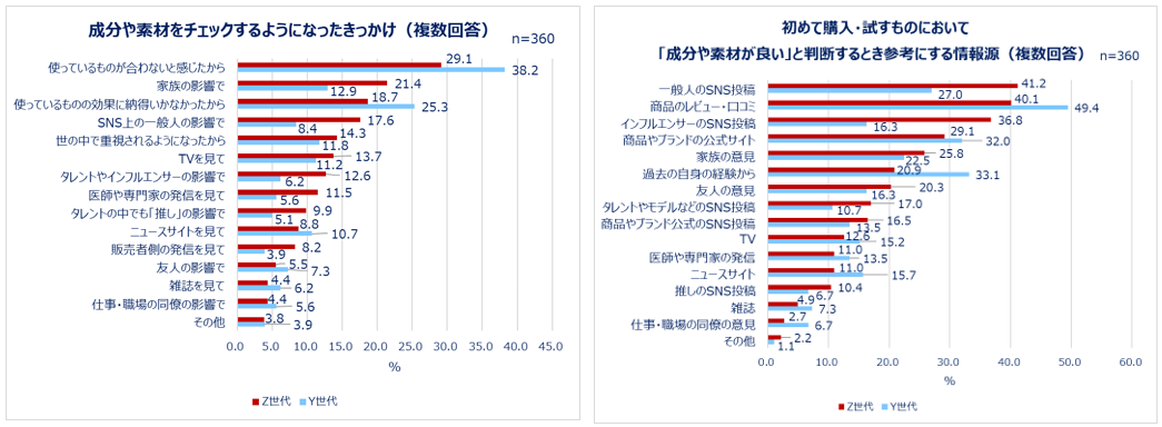 成分や素材をチェックするようになったきっかけも聞き、世代別で比較しました。Z世代は「使っているものが合わないと感じたから(29.1%)」が1位、「家族の影響で(21.4%)」が2位に。「SNS上の一般人の影響で(17.6%)」「タレントやインフルエンサーの影響で(12.6%)」「タレントの中でも『推し』の影響で(9.9%)」と回答した人はY世代よりも多く、どちらかというとZ世代の方が他者の影響を受けやすいようです。Y世代も1位はZ世代と同じ「使っているものが合わないと感じたから(38.2%)」でしたが2位は「使っているものの効果に納得いかなかったから(25.3%)」となり、違いが見えました。Y世代の方が、自身の経験をもとに行動を変える傾向にあると考えられます。
