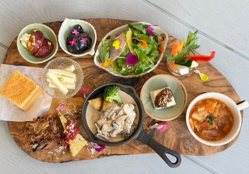 里山ごはん食堂で人気の「里山農園プレート」に秋限定できのこたっぷりの秋らしいハンバーグと秋の旬菜デリがもりだくさんのったプレートが登場。メインのハンバーグだけでなく、ひとつひとつの小鉢まで、ぜひ、秋の味覚をご堪能ください。