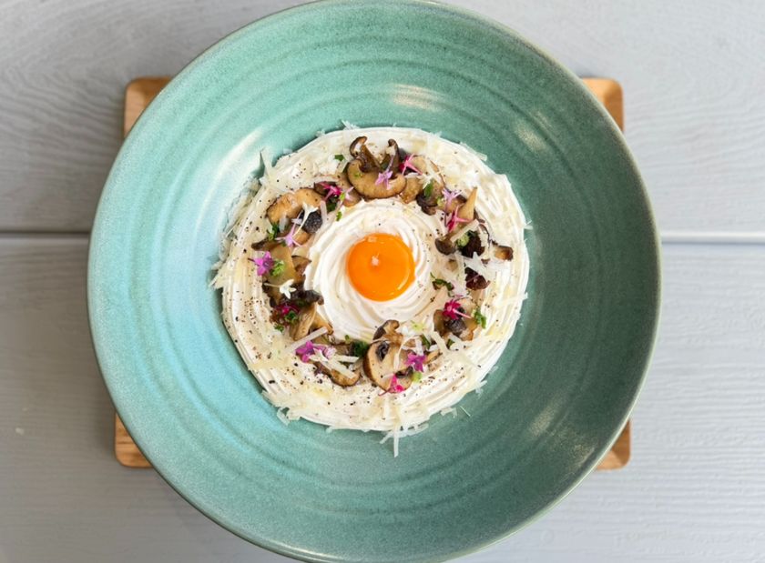 濃厚なクリームベースの出汁に松茸、埼玉産きのこをあしらい、卵黄を加えカルボナーラ風に仕立てました。仕上げに、お客様の目の前でパルミジャーノレッジャーノをおかけいたします!