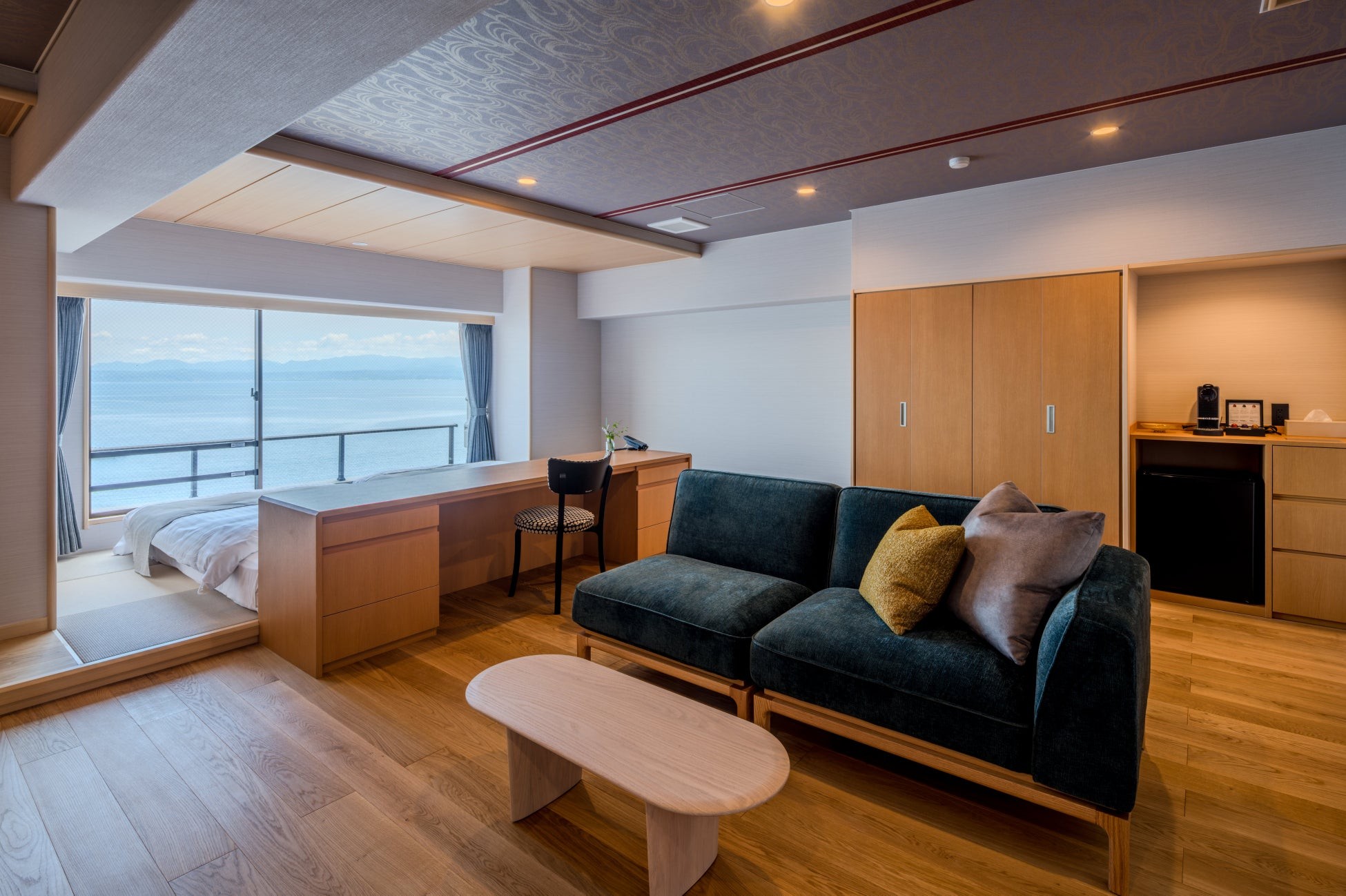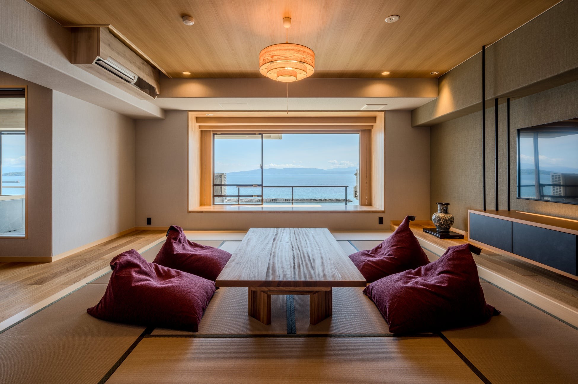2025年9月、夫婦露天風呂の宿 吟松(所在地:鹿児島県指宿市、以下「吟松」)は新客室4タイプ10室をリニューアルオープンいたしました。室内のいたる場所から錦江湾と大隅半島が見え、まるで海の上を歩いているような感覚を味わっていただけます。霧島杉の座卓や溶岩石を使った客室プレート、和紙アートなど、細部には鹿児島らしさを感じられる素材や演出も散りばめています。