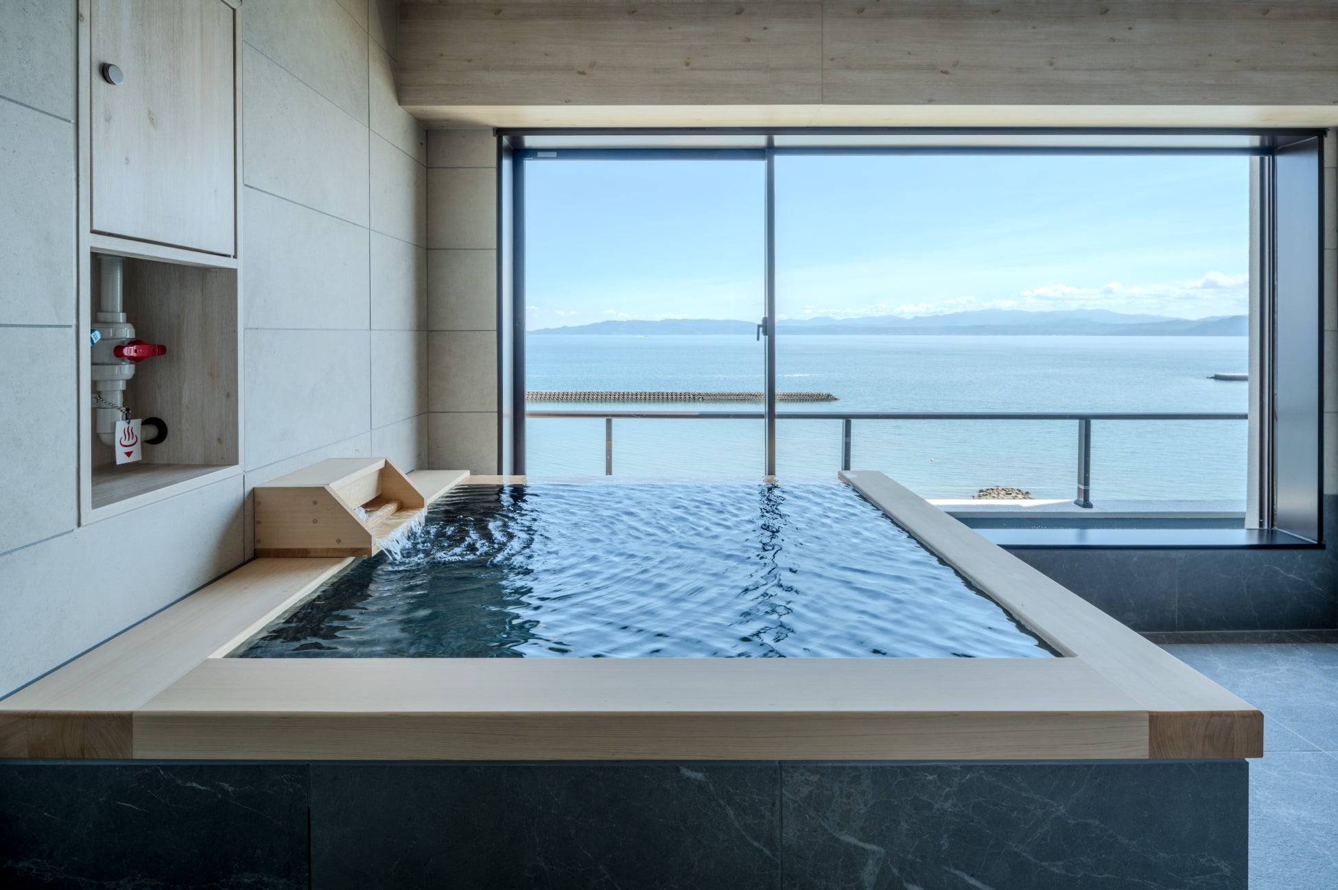 室内からは海を間近に感じられる。 ※露天風呂無し