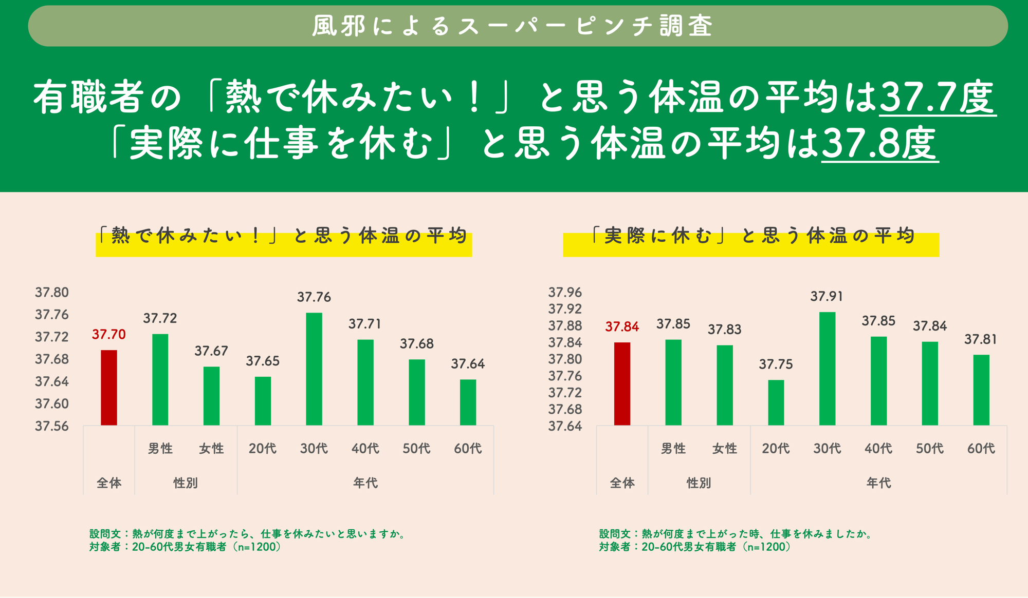 第一弾となる今回は、年末の風邪症状の実態と共に、そもそもビジネスパーソンが「熱で休みたい!」と感じる体温を調査しました。その結果から、“休みたい”と思う体温は37.7度、実際に“仕事を休む”体温は37.8度ということがわかりました。発熱時はしっかりとした療養が必要にも関わらず、忙しいビジネスパーソン故、なかなか休みづらいという状況が垣間見えました。