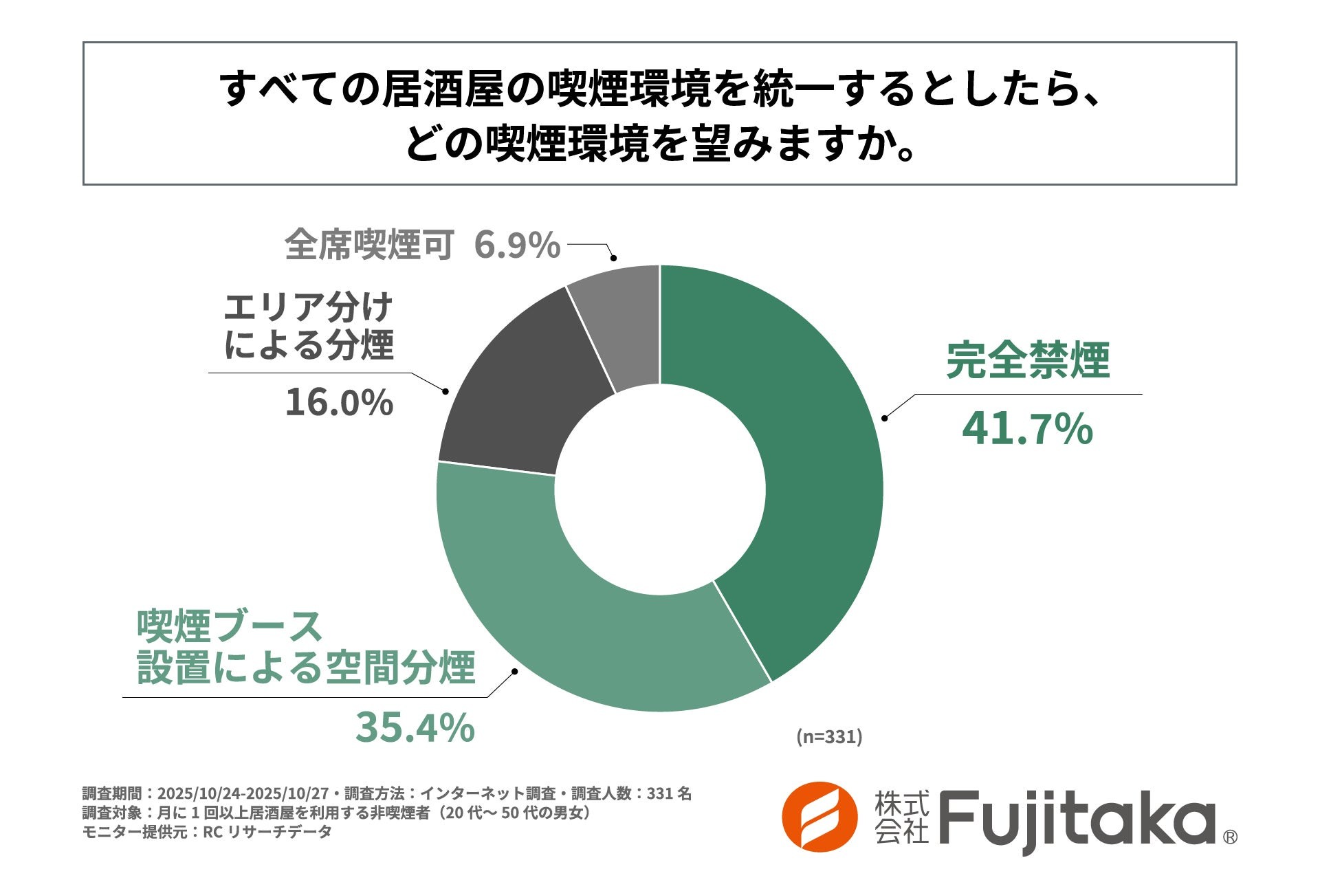**株式会社Fujitaka(本社:京都府京都市、代表取締役:髙井 茂行)は、月に1回以上居酒屋を利用する非喫煙者(20代~50代の男女)を対象に「居酒屋の喫煙環境に関する非喫煙者の意識と実態調査」を実施しました。この調査から、月に1回以上居酒屋を利用する非喫煙者における、居酒屋の喫煙環境が店選びに与える影響や、同行者の喫煙習慣の有無によって選ぶ店の喫煙環境などが明らかになりました。**
