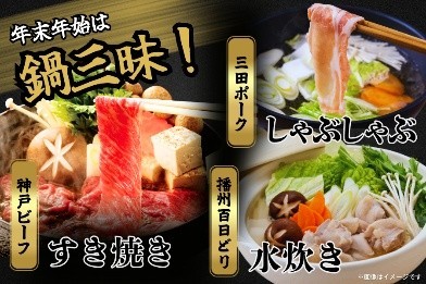 兵庫ブランドの「神戸ビーフ」、「播州百日どり」、「三田ポーク」の3種のお肉を鍋料理に使いやすいカットと量で個包装し、お届けします。