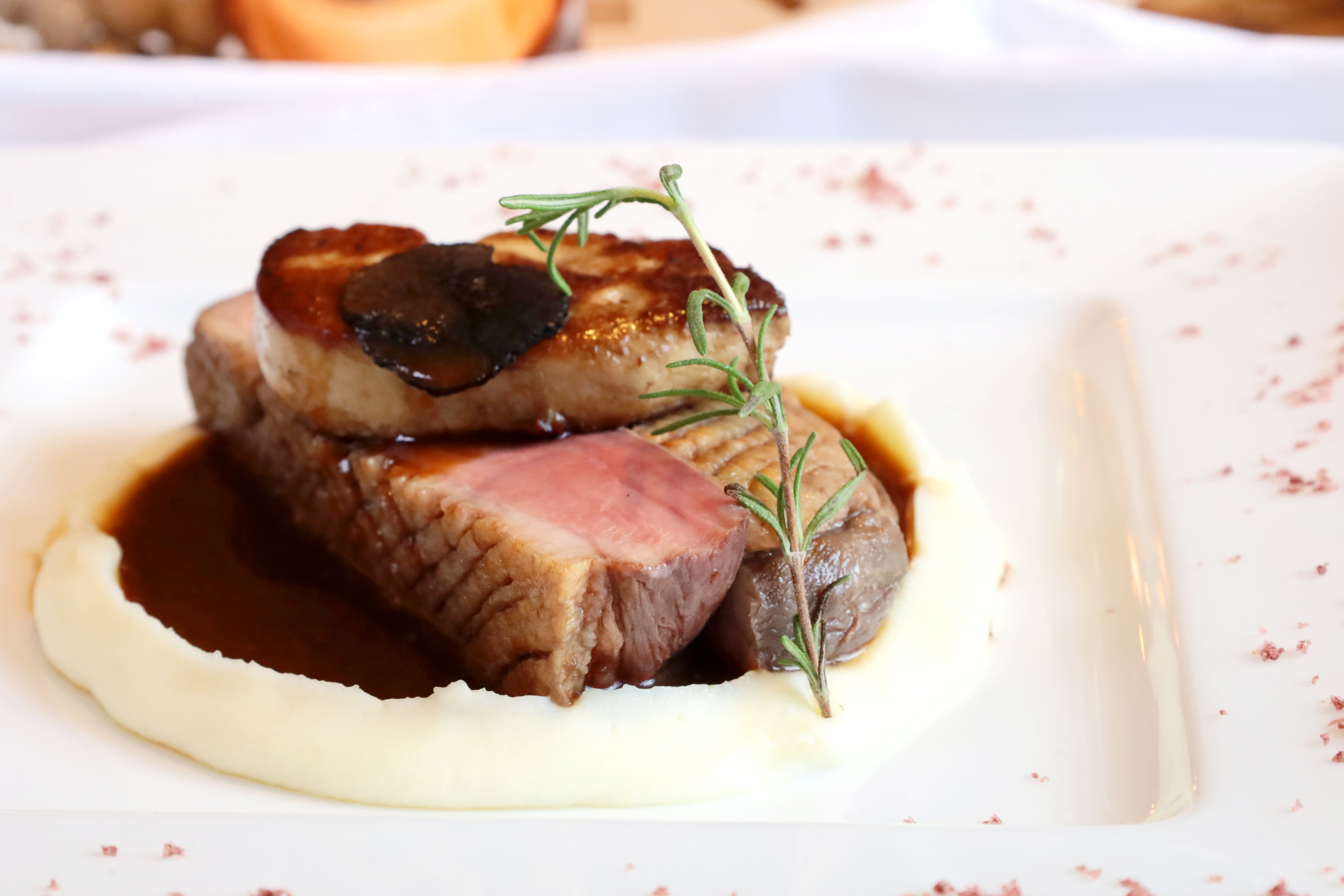 ふっくら焼き上げたカモのロティを贅沢なロッシーニ仕立てに。旨味と香ばしさが重なる一皿です。