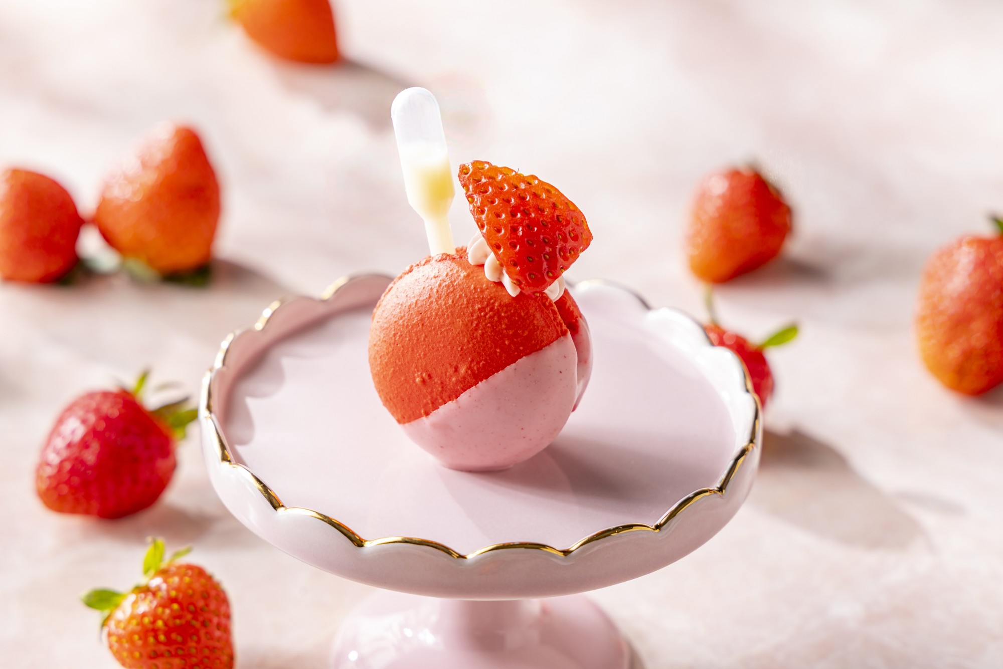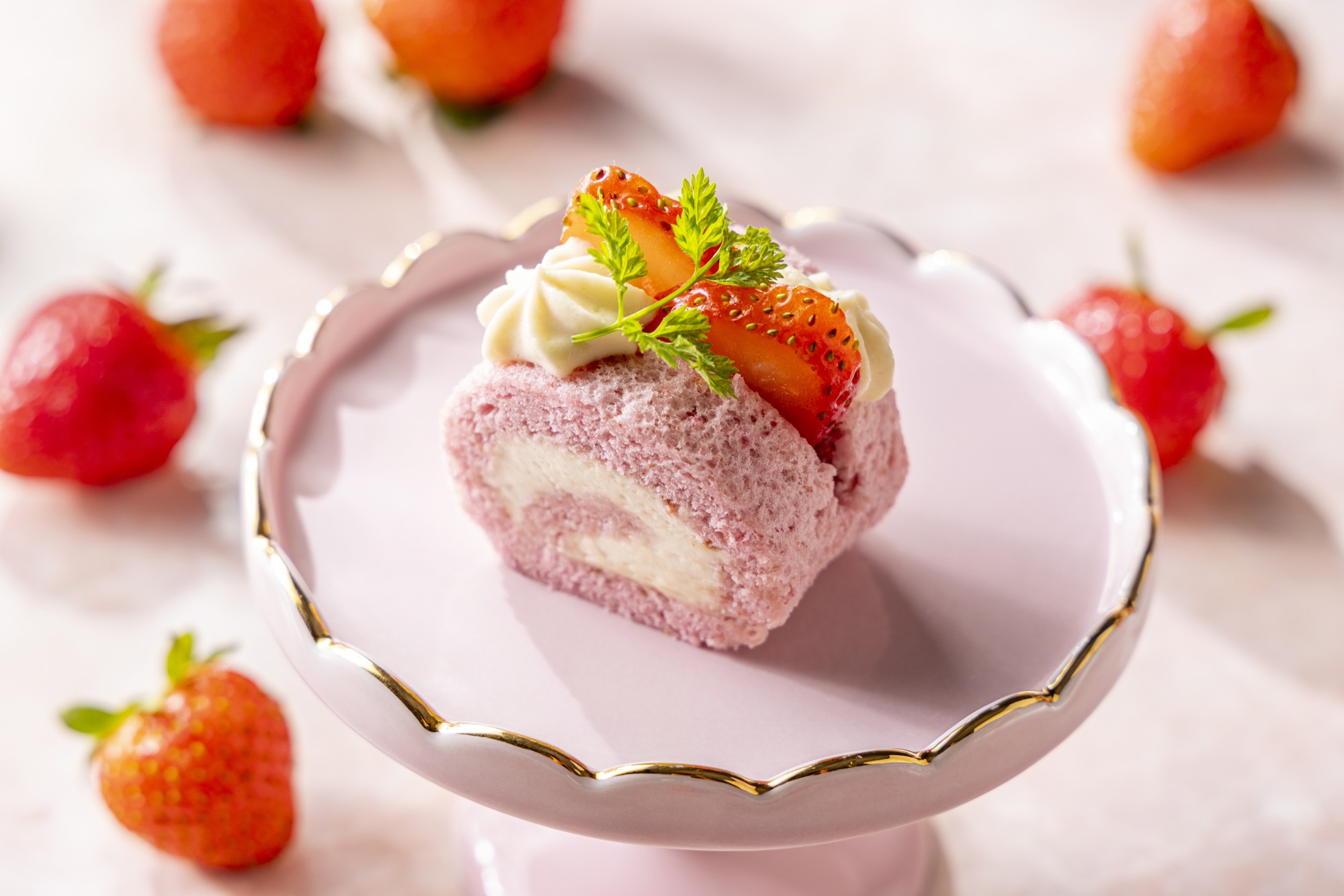 旬の苺が持つ甘酸っぱい魅力を多彩に表現したスイーツの数々には、苺のババロアとゼリーを2層に仕立てたグラスの上に、丸ごと苺のショートケーキを重ねたアイコニックなパフェをはじめ、練乳をスポイトでお好みに調整できる苺のマカロンや、ダージリンとホワイトチョコレートの香りが広がる苺のロールケーキなど、味わいと香りのバランスにこだわった7種のデザートが揃います。セイボリーは、苺と赤ワインビネガーが織りなす芳醇な香りがスモークダックの旨みを引き立てる一品や、苺とクリームチーズを巻いた華やかなラップロールなど、食事としても楽しめる6種をご用意。スコーンと紅茶やコーヒーとともに、優雅なティータイムをお過ごしください。