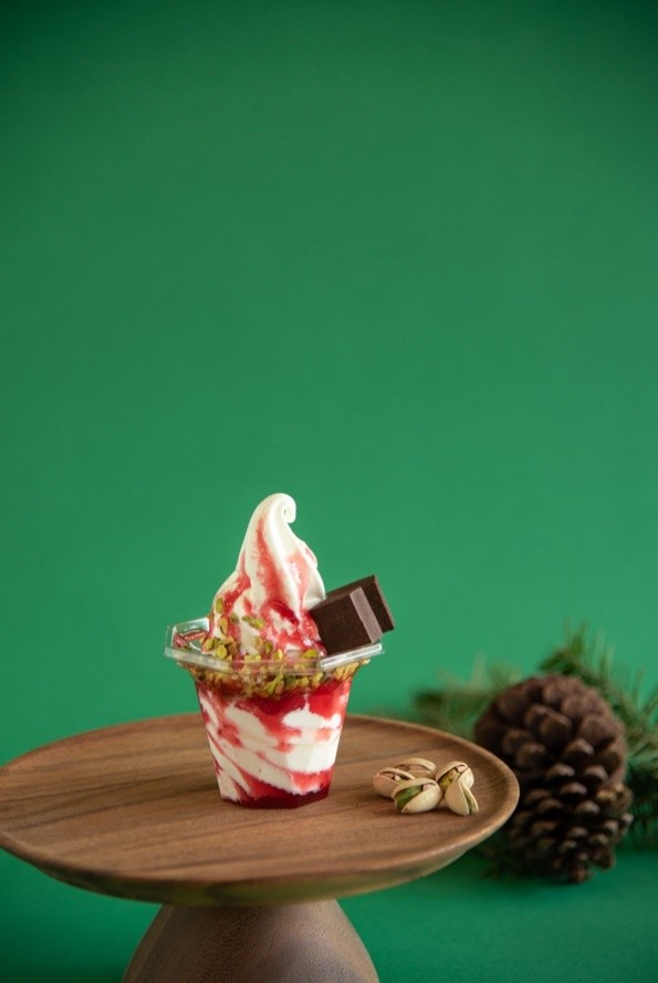 ・クリスマスサンデー 580円:ラズベリーソースとピスタチオナッツのハーモニー。生チョコレートも添えたちょっと贅沢なサンデーです。
