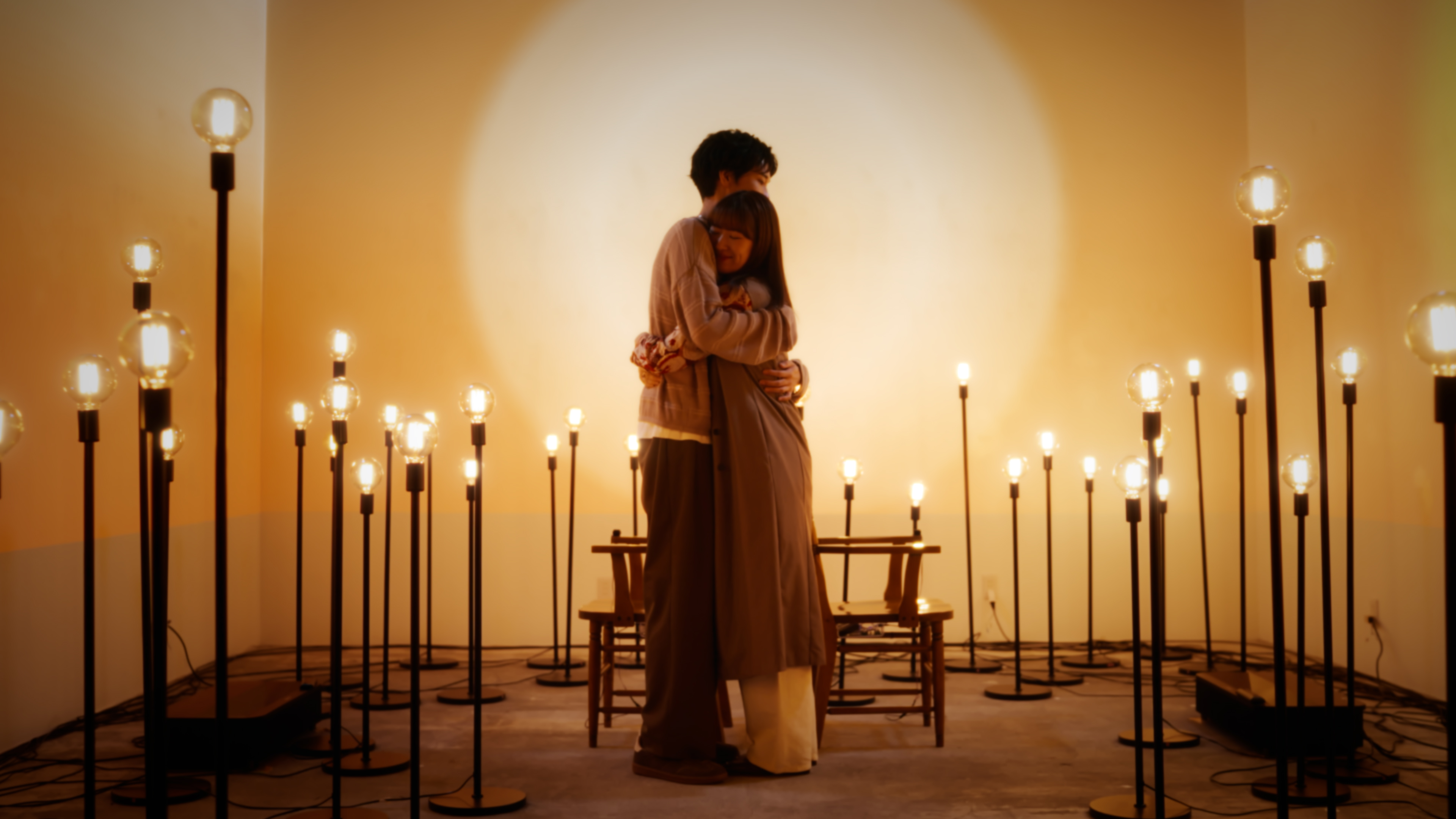 光と音、そして心拍センサーを組み合わせた没入型のアート体験です。来場者は暗闇の空間で背中合わせに座り、互いの姿が見えない状態で手を握り合います。心拍センサーが両者の鼓動を計測し、鼓動のリズムが光と音として空間全体に表現されます。視覚や言葉に頼らず、触れ合いと生体反応を通じて、感情的なつながりや共鳴を体感できる新しいアート体験となっています。
