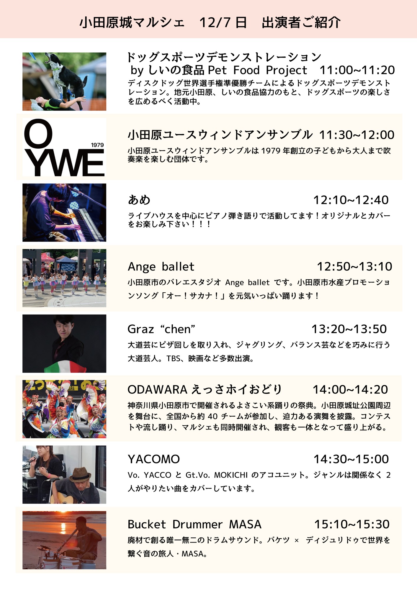 地元音楽家のライブ、伝統芸能の披露など、マルシェを彩る催しが盛りだくさん。「おだわらんらんフェスタ」とのコラボで、ダンスやパフォーマンスも終日楽しめます。