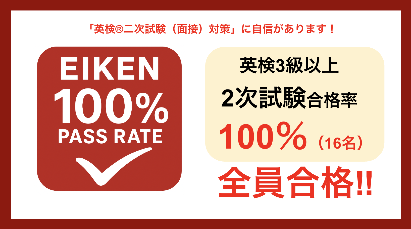 特に、英検3級以上の2次試験は受験者全員が合格(合格率100%、16名)という快挙を達成しました。