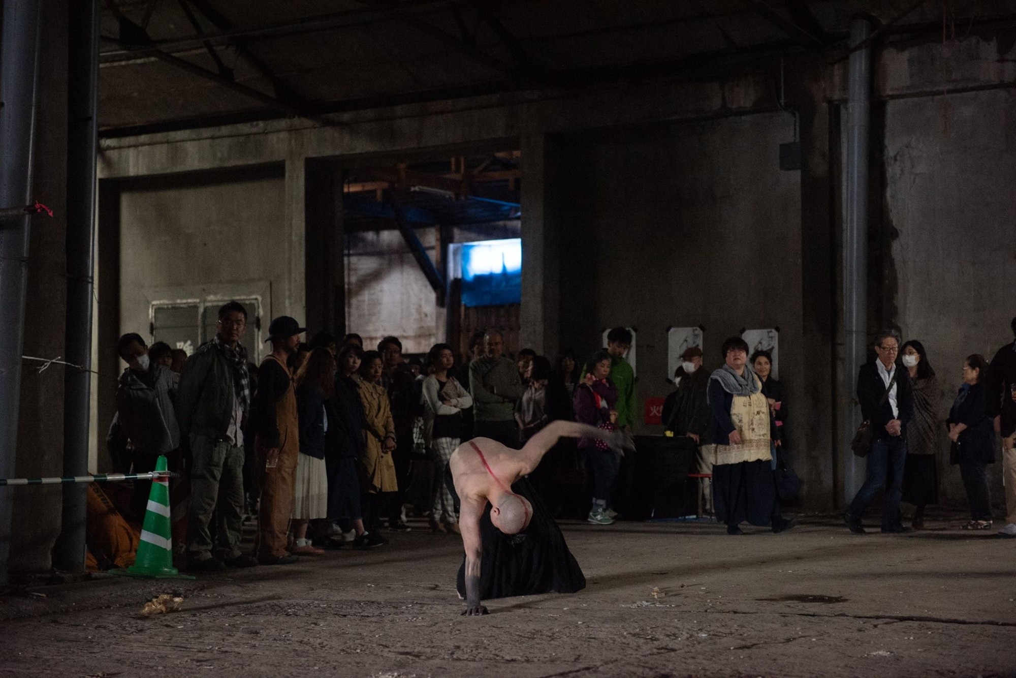 巨大なサルベージ倉庫で行われた公演。観客を引き連れながらパフォーマンス。