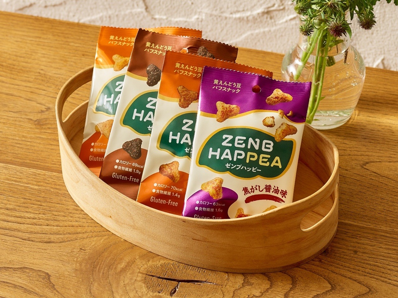 おいしくカラダにいいZENBを日常の“おやつ時間”から気軽に体験してほしいという想いから「ZENBハッピー」を開発しました。商品名の「HAPPEA(ハッピー)」には、いつでも気兼ねなくおやつを食べられる“幸せ(HAPPY)”と、“黄えんどう豆(YELLOW PEA)”からできた新しいおやつという意味を込めています。