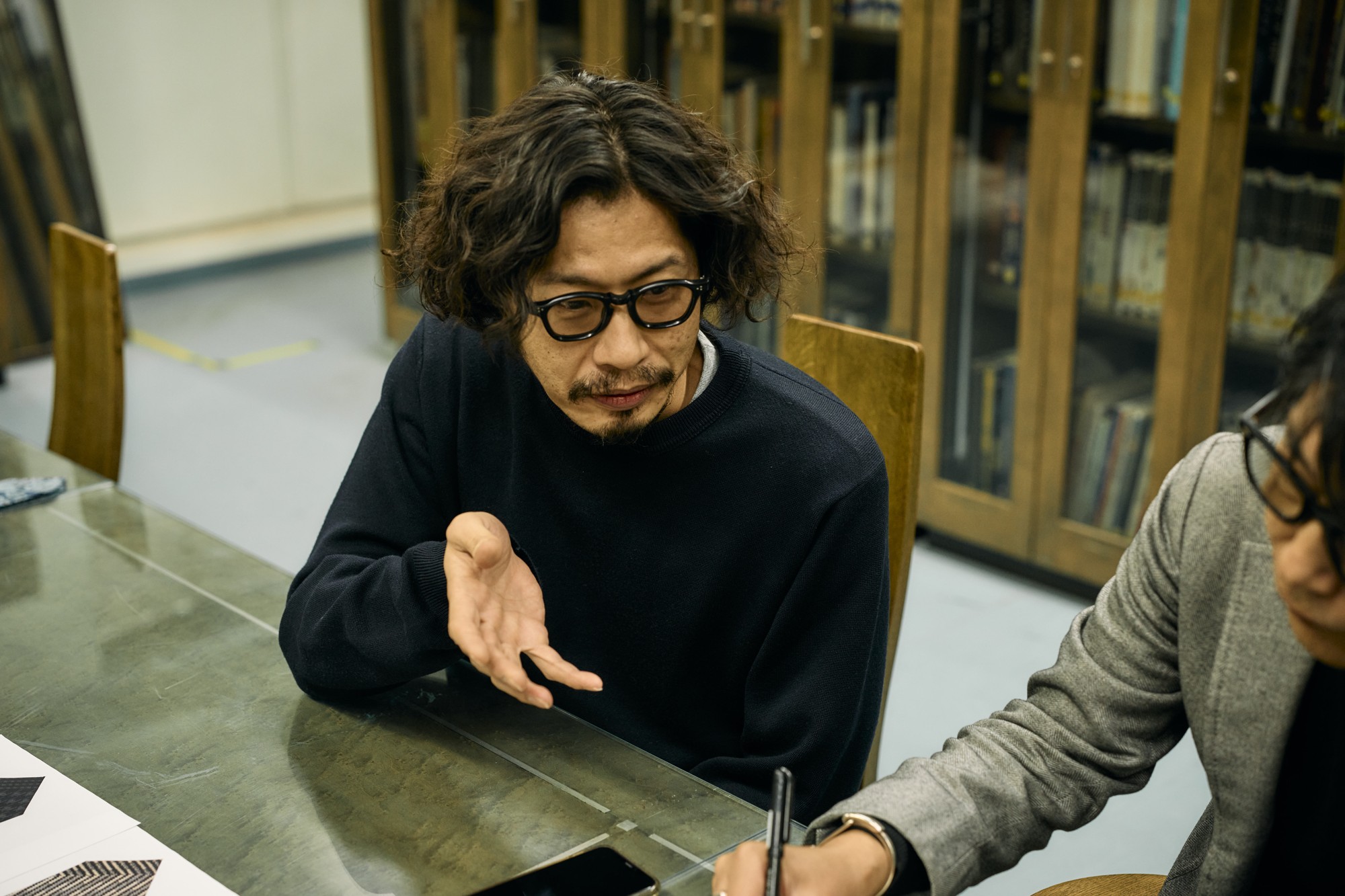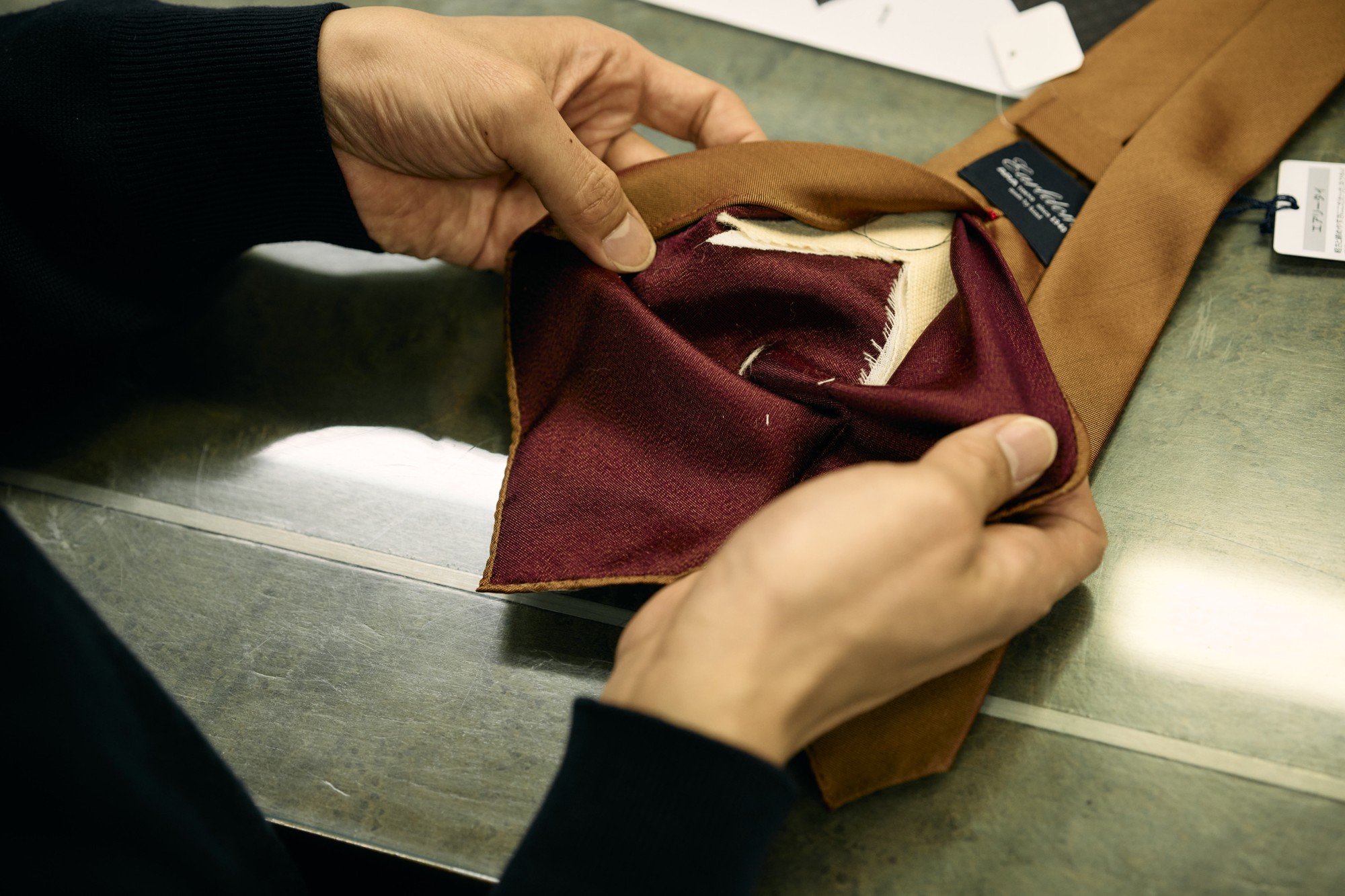アールダムの「エアリータイ」をチェックする四方さん。「軽いけれど、生地感自体はしっかりしていて、仕立ても本格的なんですね」(四方さん)