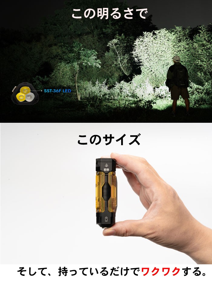 一般的な懐中電灯の明るさは200-400ルーメン程度ですが、WUBEN【E8】はSST-36F LED×2個搭載で、明るさ最大1300ルーメンとかなりの高輝度を誇ります。色温度は5000K(昼白色) で、生き生きとした自然な光色です。最大照射距離は109m。