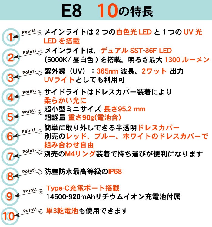 今回新たに登場した、超小型LED懐中電灯WUBEN【E8】の特長の一つが、メインライトLED×2個搭載で周囲を圧倒的な光で照らします。また、汚れ確認など色々な用途があるUV光LED×1個搭載。