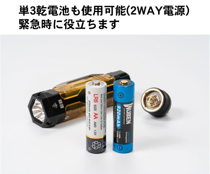 WUBEN【E8】は充電式リチウムイオン充電池に加えて、エネループや市販の単3アルカリ電池も使用可能。