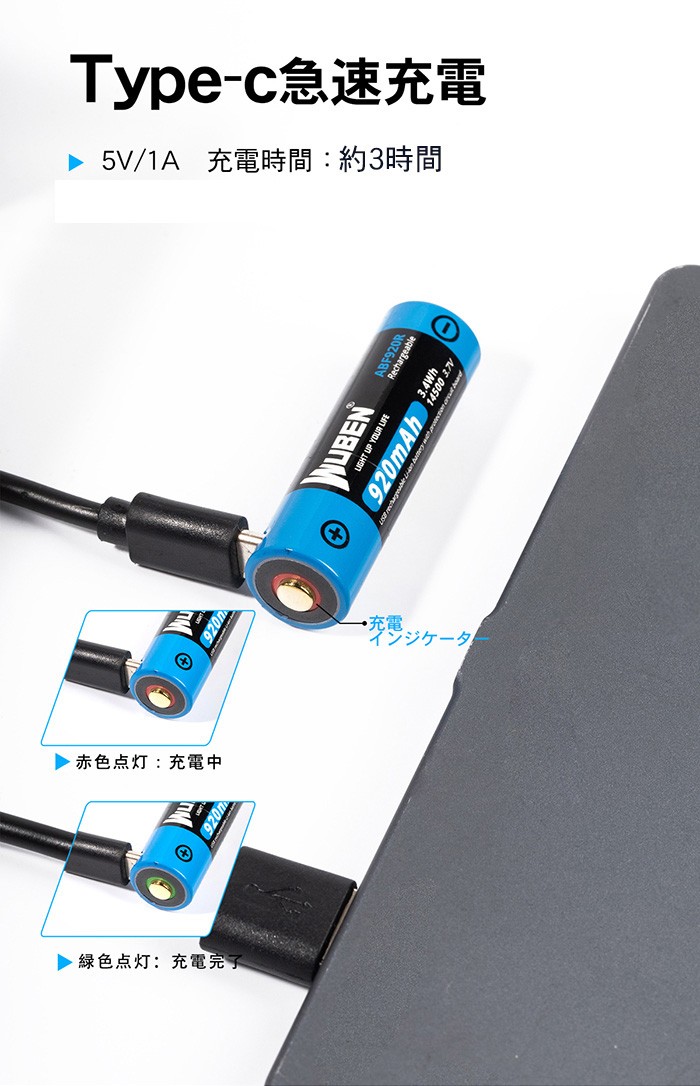 充電ポート搭載で電池へ直接Type-C充電ケーブルを差し込み充電します。