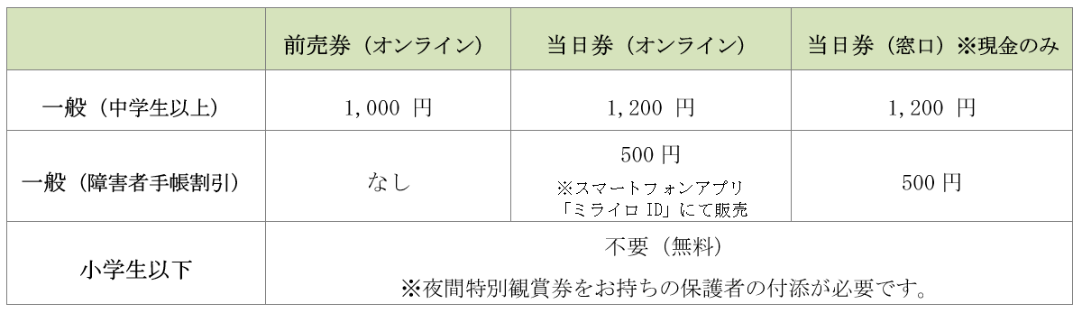 ※小学生以下のお子様は無料でご入場可能です。(夜間特別観賞券をお持ちの保護者の付添が必要)