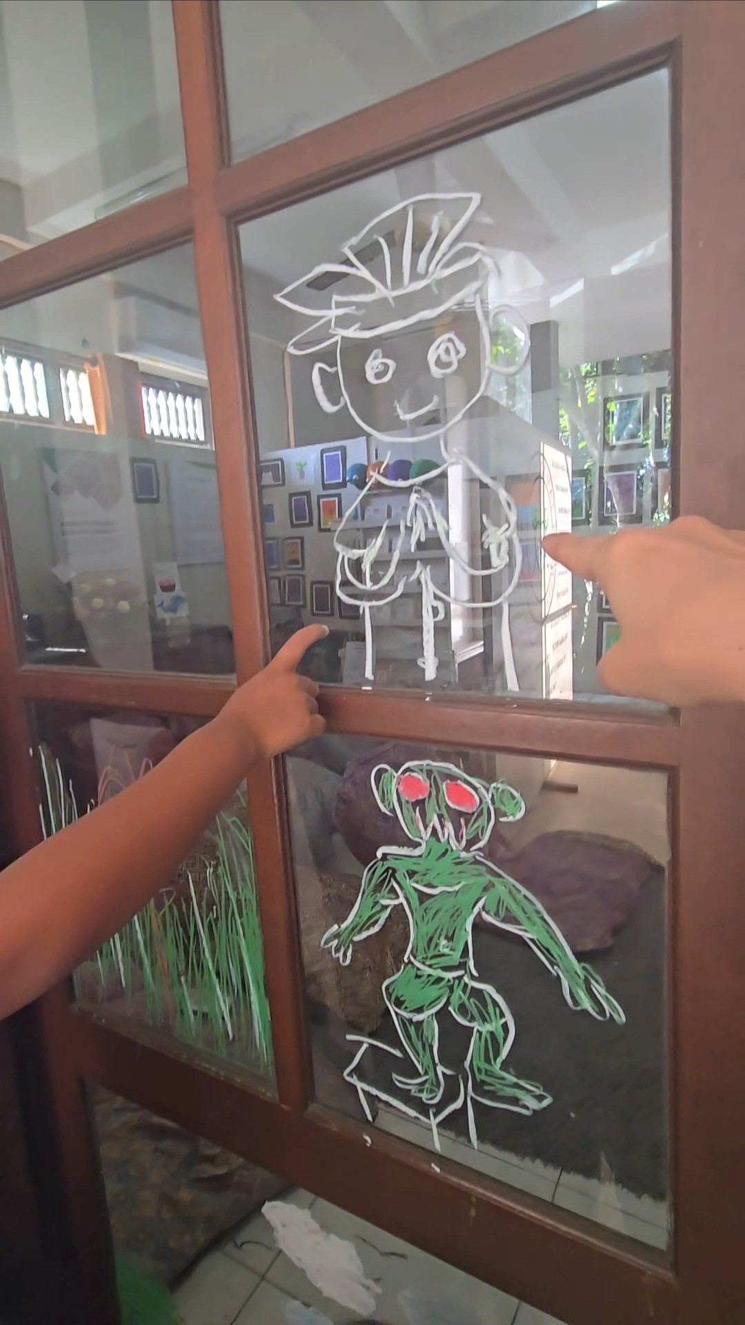 大きな窓にガラスにかけるクレヨンでお絵かき