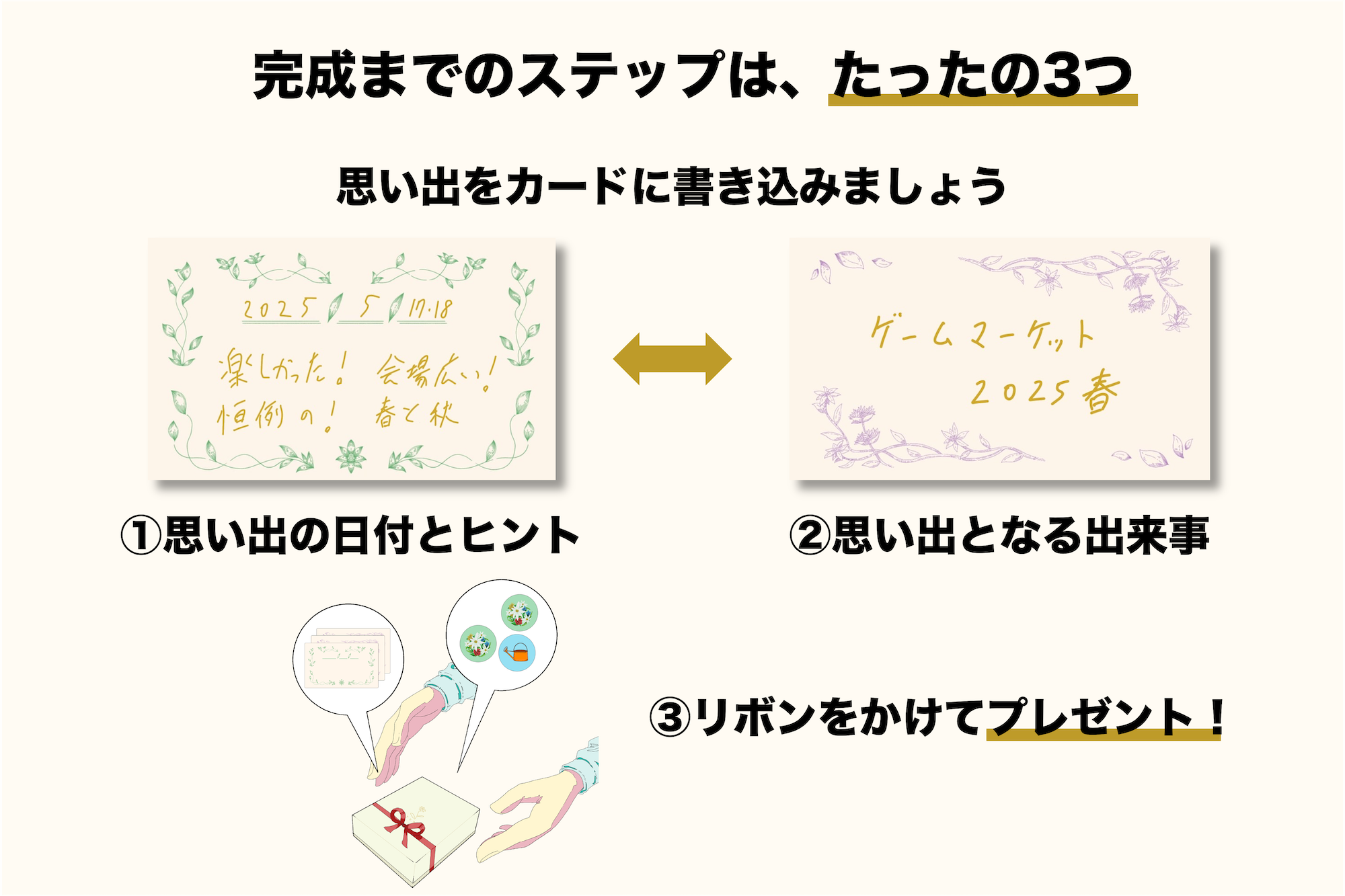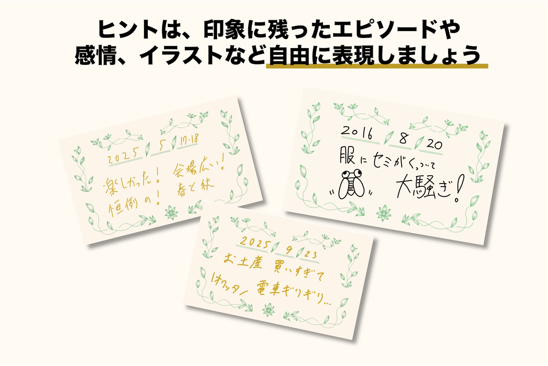 ヒントは、思い出に関する印象深いエピソードや、感情、イラストなど自由に表現できます。贈り手の個性や創意工夫が際立つカードになります。