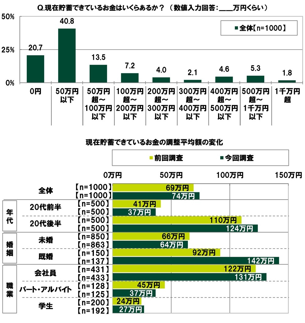 前回の調査結果と比較すると、現在貯蓄できているお金の調整平均は5万円の増加(前回調査69万円→今回調査74万円)となりました。