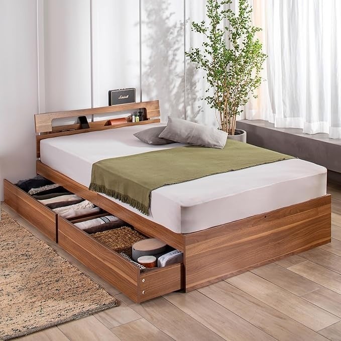 GOKUMINの「コンフォートバンブーベッド たっぷり収納タイプ」は、耐久性と清潔性に優れた竹すのこベッドの機能性モデルです。丈夫で弾性に富んだ竹素材は、一般的な木材の約2〜3倍の強度を持ち、すのこ構造が通気性を高め湿気やカビを抑制します。大容量の引き出しが2杯付いているため、寝具や衣類などの収納スペースとして空間を有効活用できます。さらに、枕元の宮棚にはコンセントとLED照明を搭載し、スマホ充電や夜間の手元照らしにも便利な設計です。ウォールナットカラーの落ち着いたデザインで、新生活にもフィットする一台です。
