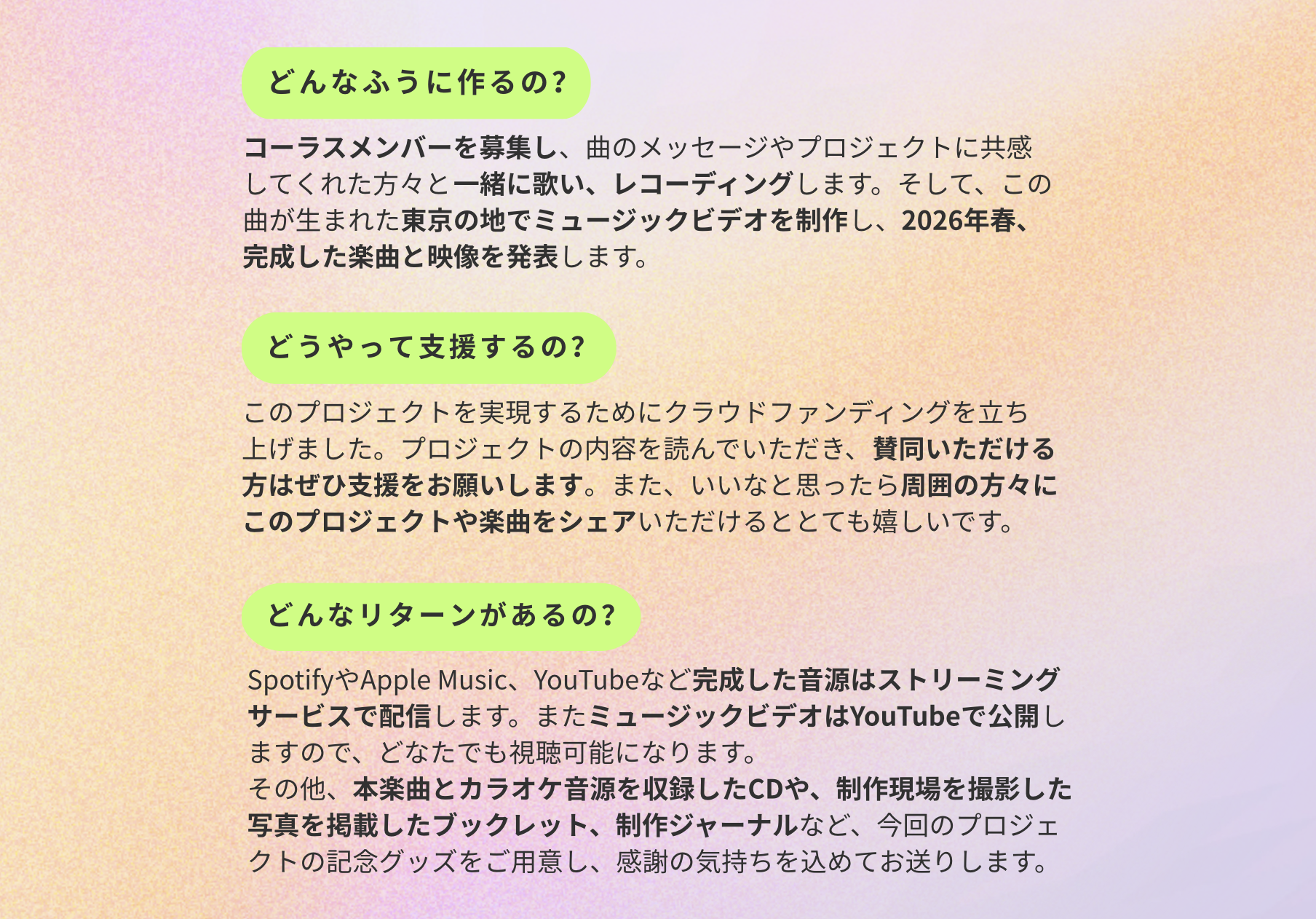 『明日へつづく道』制作プロジェクトのクラウドファンディングは2026年1月30日(金) まで実施。2026年3月のリリースを目指し制作を進めていきます。完成した楽曲は各種ストリーミングサービスにて配信、またミュージックビデオはYouTubeにて一般公開します。