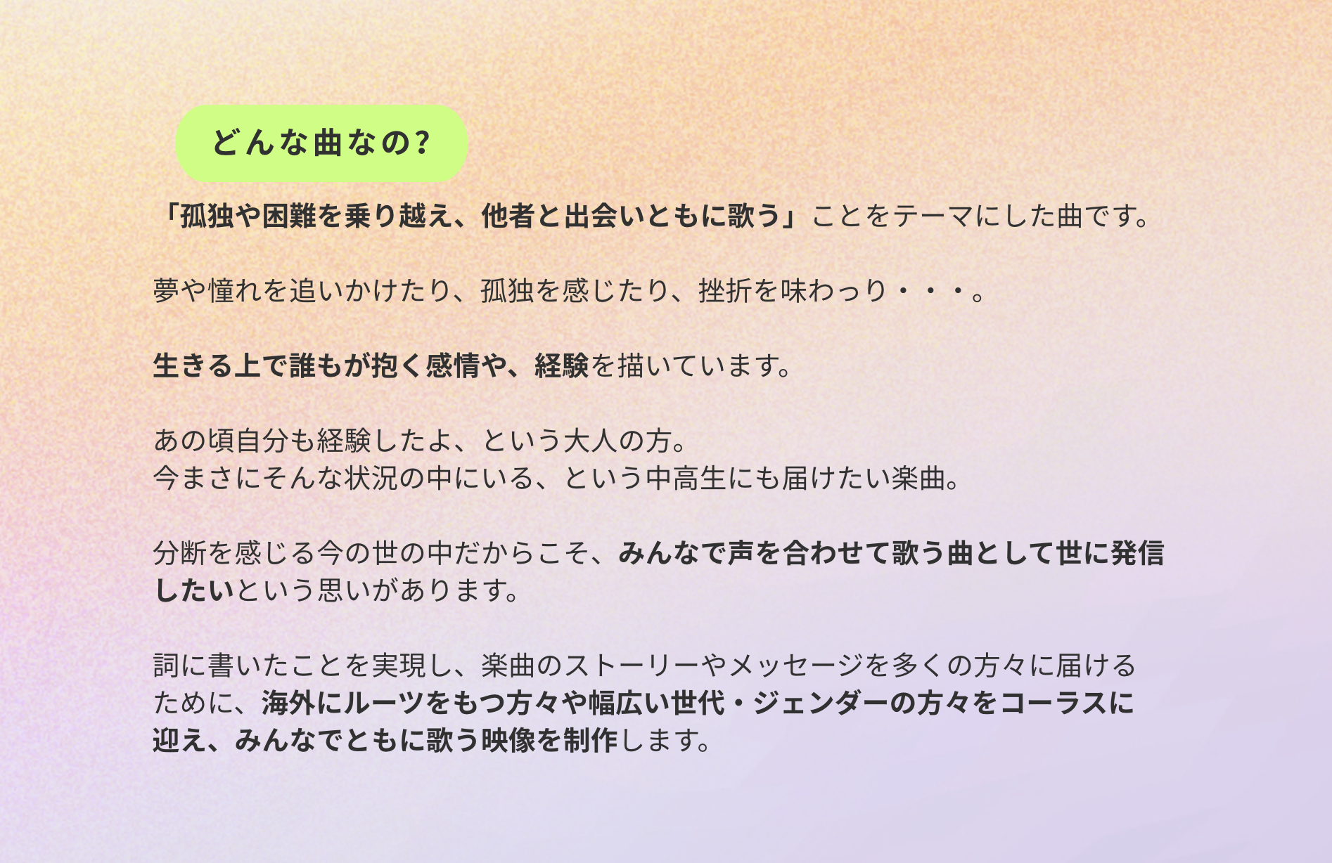 「あの頃の自分がつらい状況の中でも未来に希望を見出そうとしたように、今の日本で生きづらさや困難さを抱えている人たちにも、この楽曲を通じて希望を感じてもらえたらと願っています」