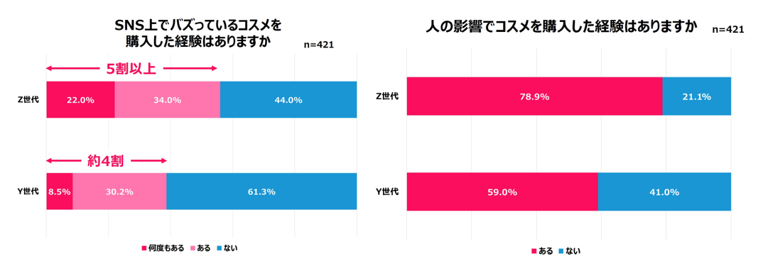 Z世代半数以上、Y世代約4割がSNSでバズっているコスメを購入した経験あり。