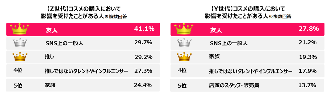 Y世代よりZ世代の方が「友人」「推し」など人の影響でコスメを買う傾向