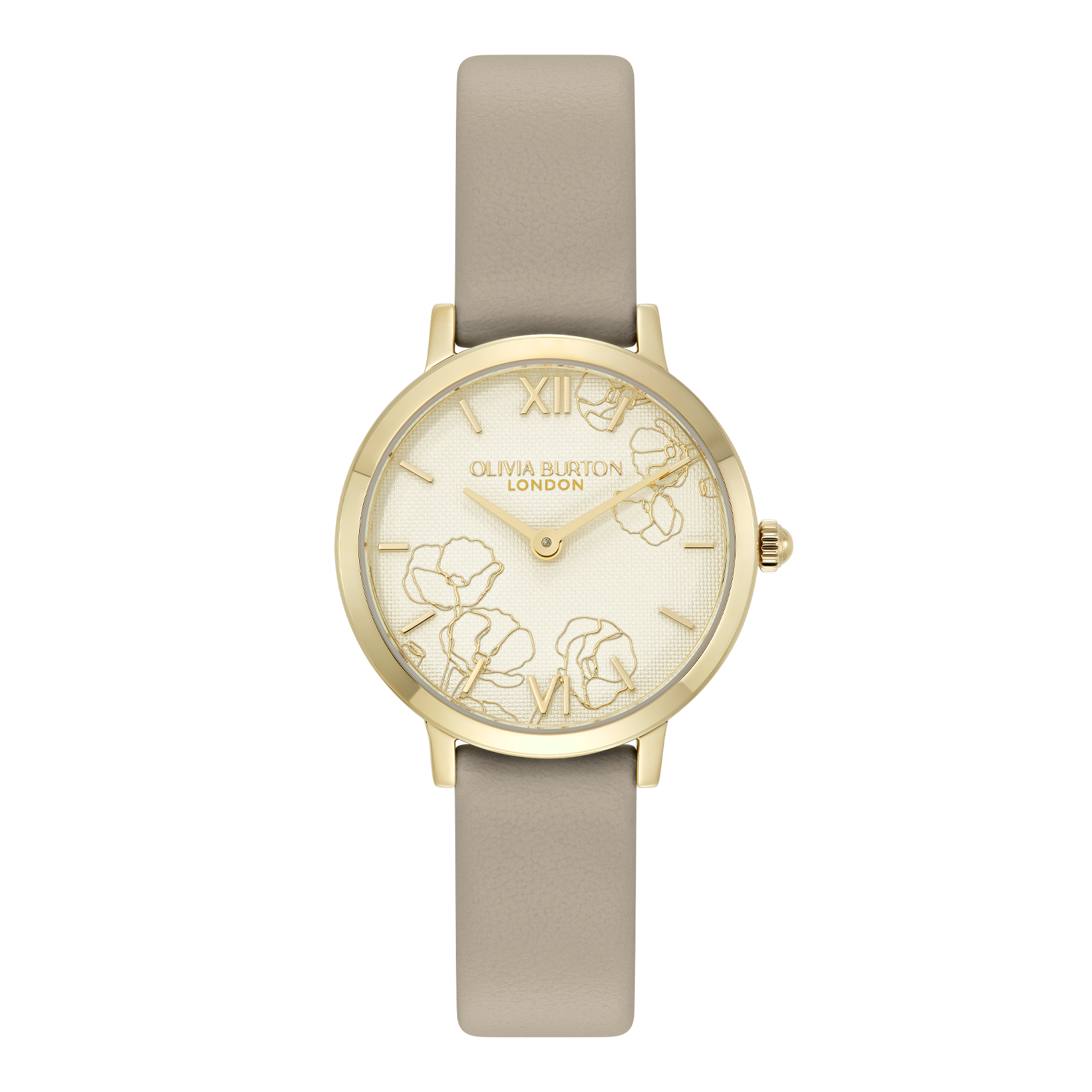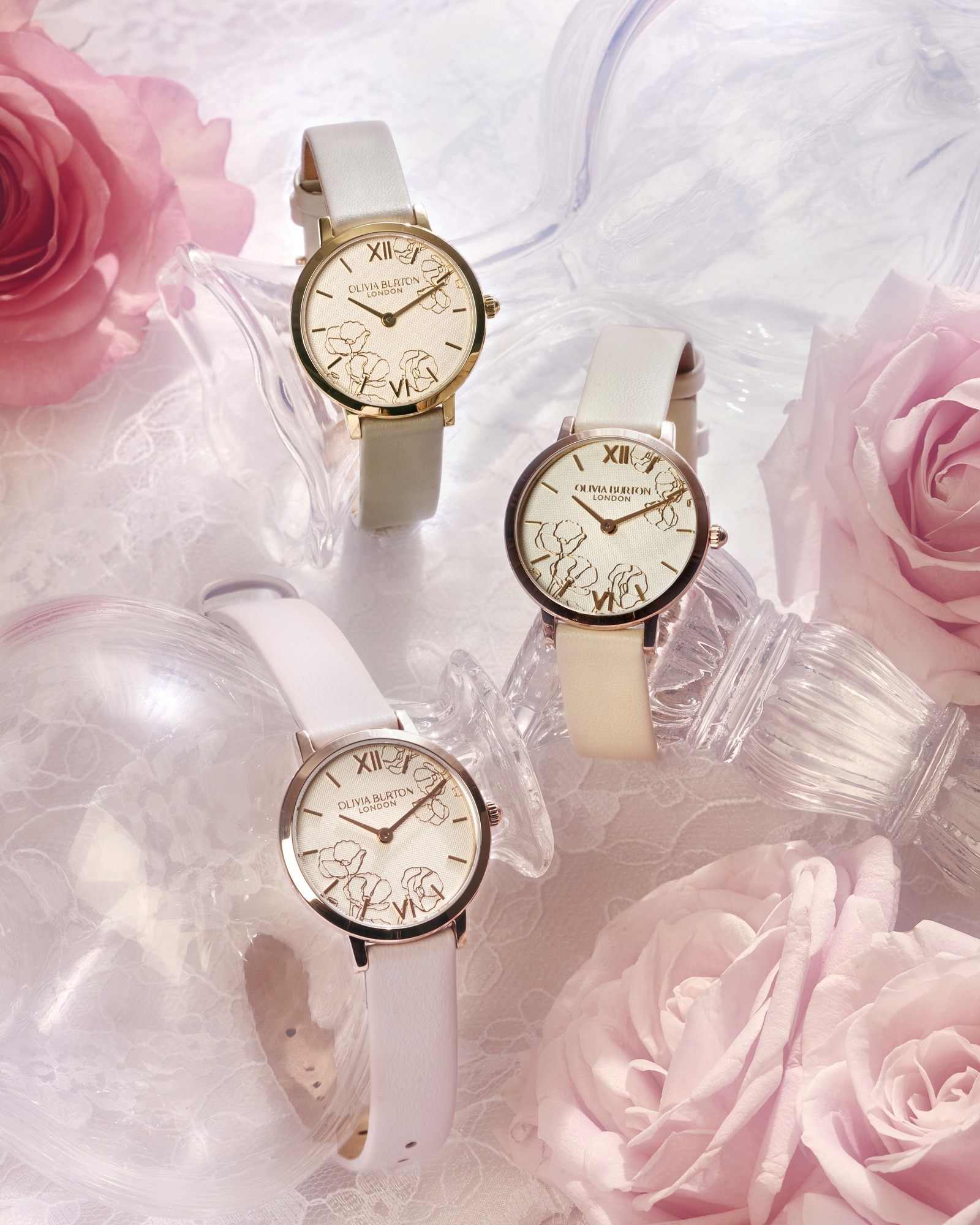 柔らかなアイボリーカラーの文字盤には、繊細なゴールドラインで描かれた抽象的な花々をあしらい、可憐でありながらも凛とした印象に。上質なメタリックの輝きが春の光を受けて、まるで花びらが風に揺れるように、手元に優雅なニュアンスを添えます。カラーは、それぞれ異なる表情を楽しめる3色展開。
