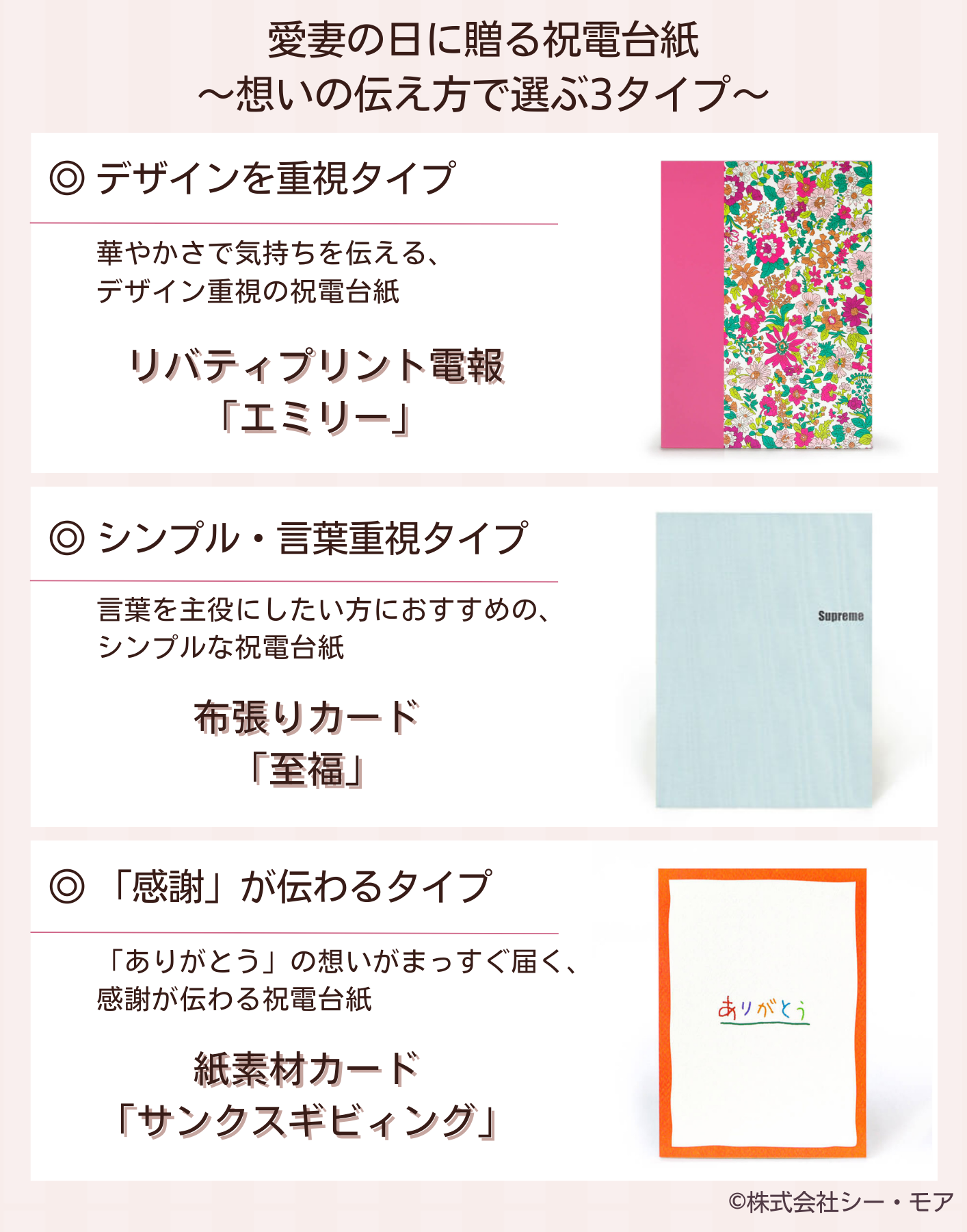 電報屋のエクスメールでは、愛妻の日の想いをより伝えやすくするため、祝電台紙を「想いの伝え方」に合わせて3つのタイプに分けてご紹介します。