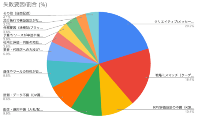 期待した成果が出なかった企業にその「最大の要因」を調査したところ、最も多かった回答は「クリエイティブ/メッセージの弱さ(20.2%)」、次いで「戦略ミスマッチ(ターゲット/提供価値/ポジション)(18.4%)」でした。