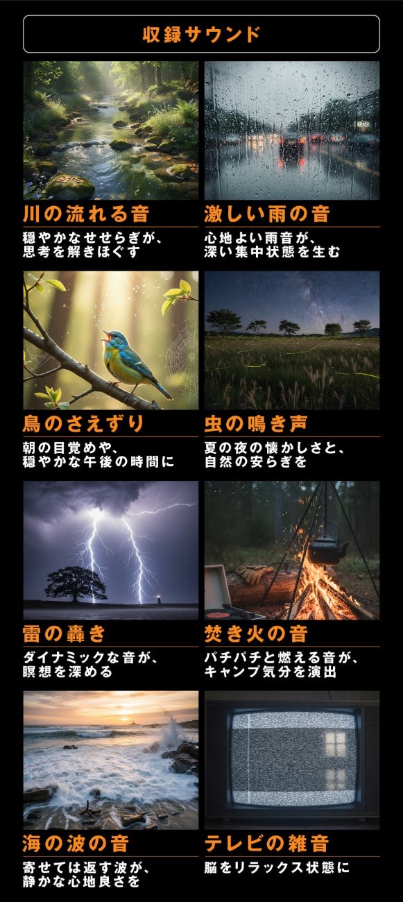 **「川の流れる音」「激しい雨の音」「鳥のさえずり」「虫の鳴き声」「雷の轟き」「焚き火の音」「海の波の音」「テレビの雑音」**の8種類です。
