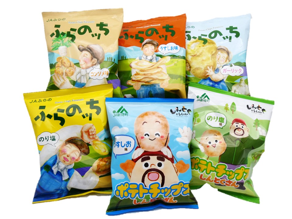 セット内容:JAふらの ふらのッち 4袋(のり塩・コンソメ味・うすしお味各60g×1袋、ガーリック 55g×1袋)、JA新得町 ポテトチップスしんとくさん2袋(のり塩味・うすしお味 各60g)、シークレット商品×2袋