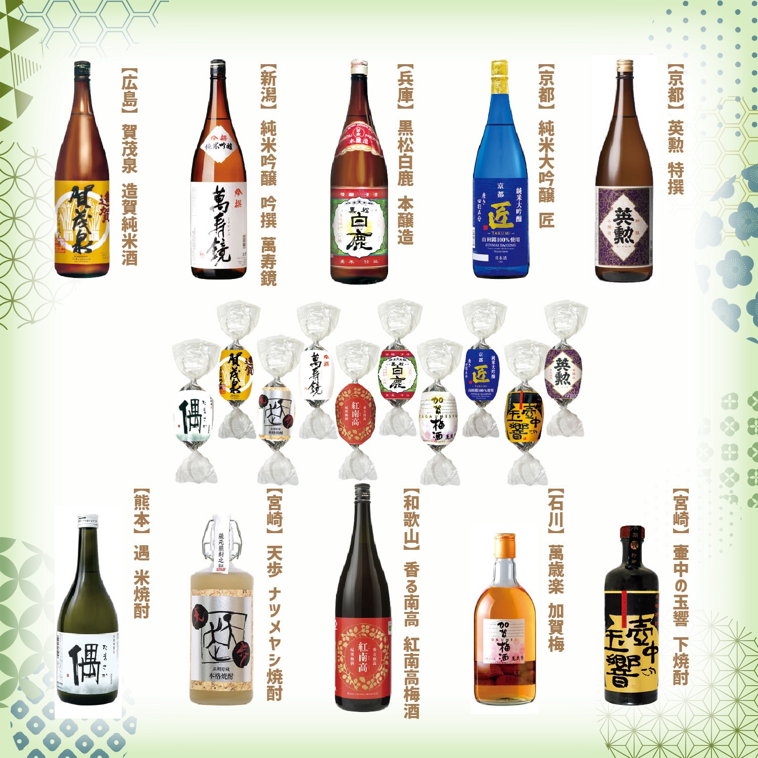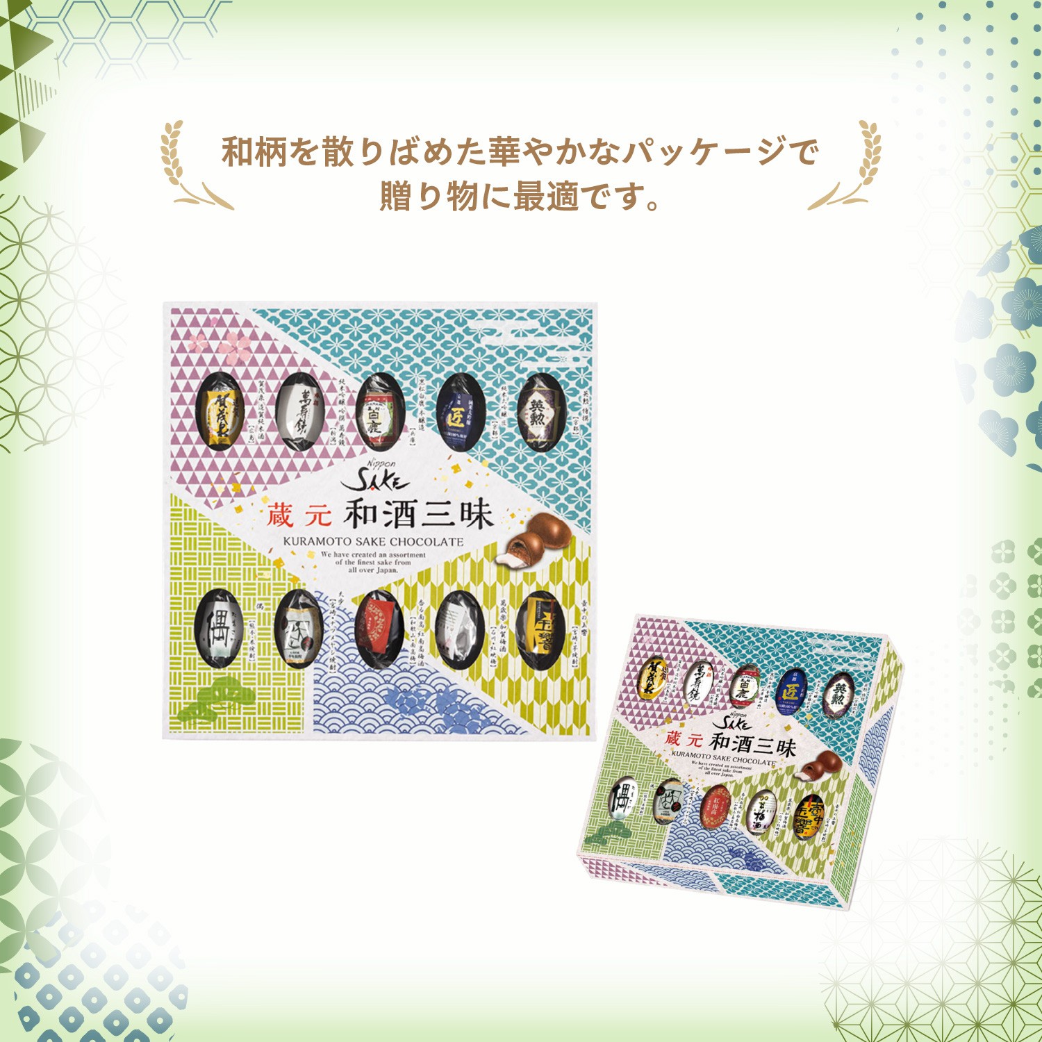 「和酒ボンボンチョコ」の最大の特長は、全国各地の代表的な銘酒を厳選し、ボンボンチョコの中に組み合わせた点です。日本を代表する酒どころの品々が一堂に集結しています。