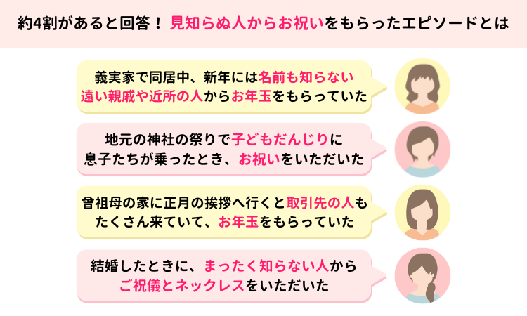 今回のアンケート結果からは、知らない人からのお祝いの背景に「地域の濃い人間関係や祭り文化」「家業を通じた縁」「個人の人柄」など、さまざまな要素があることが見えてきました。現代では珍しく感じられる文化も、地域によっては今なお自然に続いており、“祝う”気持ちが受け継がれています。