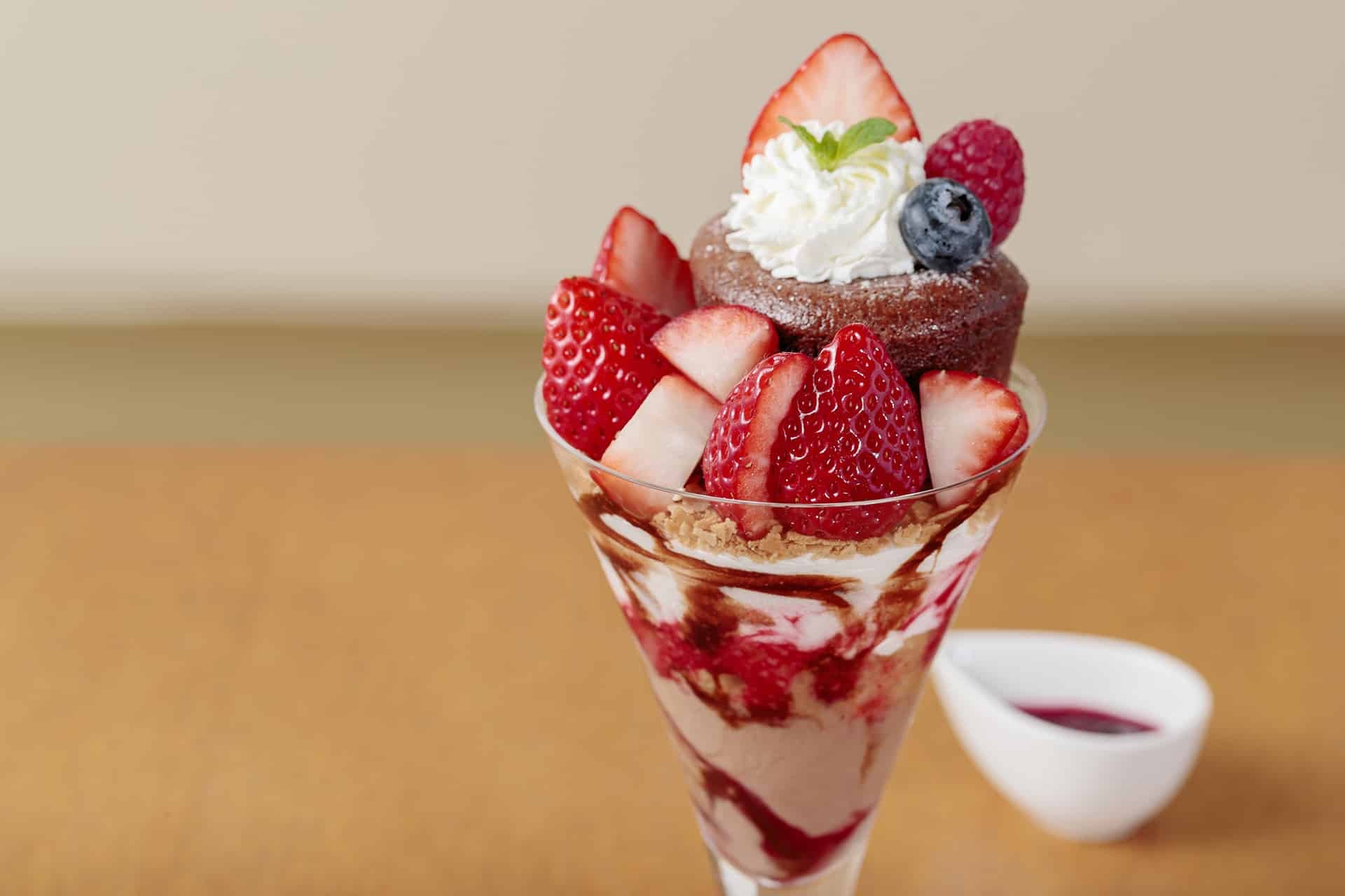 あたたかくとろける自家製フォンダンショコラに、みずみずしいいちごの酸味が重なるパフェです。