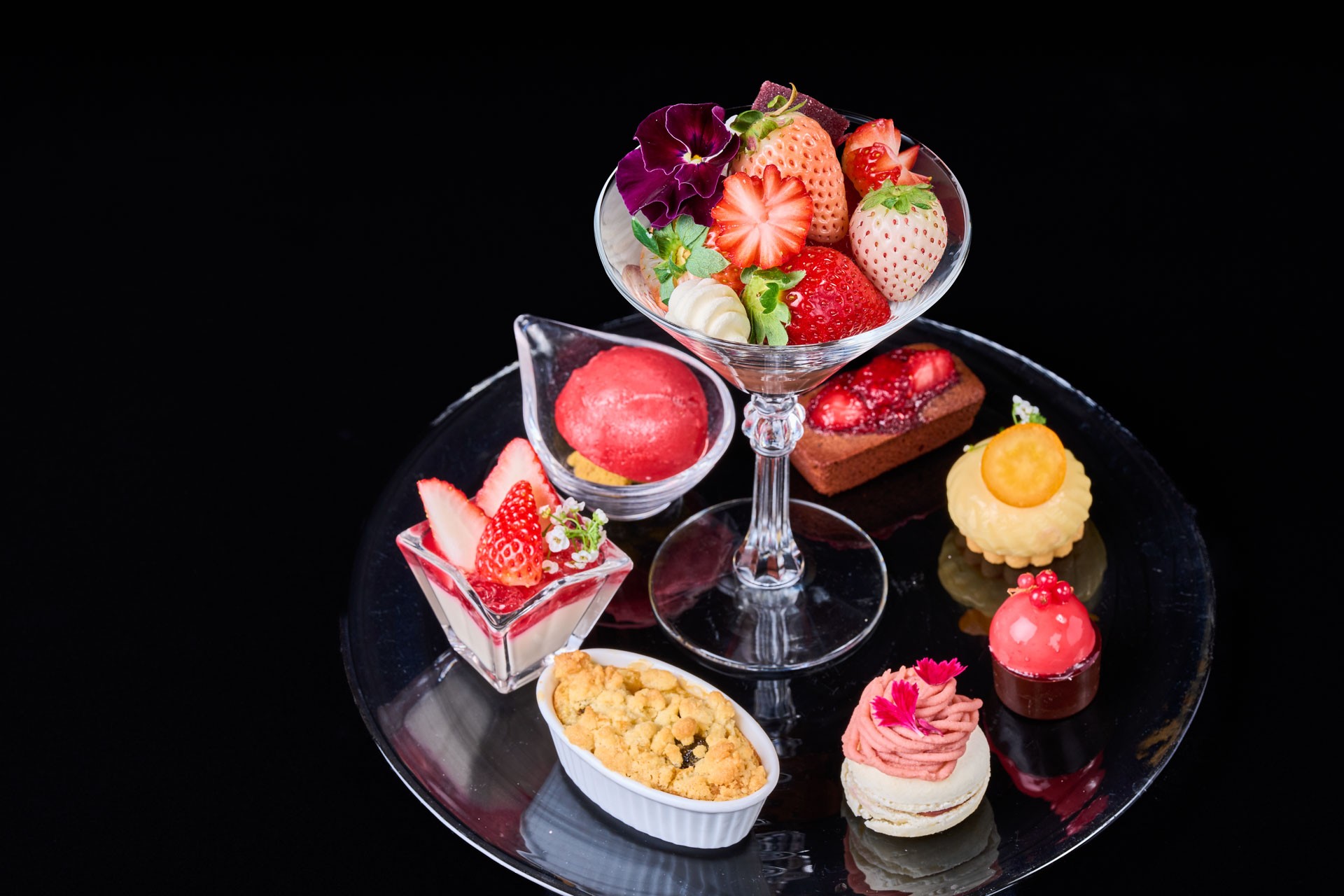 グラスに盛り付けられた個性の異なるいちごの魅力を感じながら、上質なお菓子との食べ合わせを楽しめる贅沢な盛り合わせです。