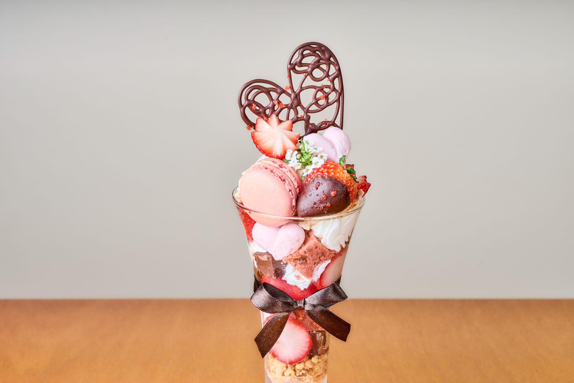 旬のいちごと濃厚チョコレートを重ね、マカロンとハートメレンゲを飾った華やかなパフェです。