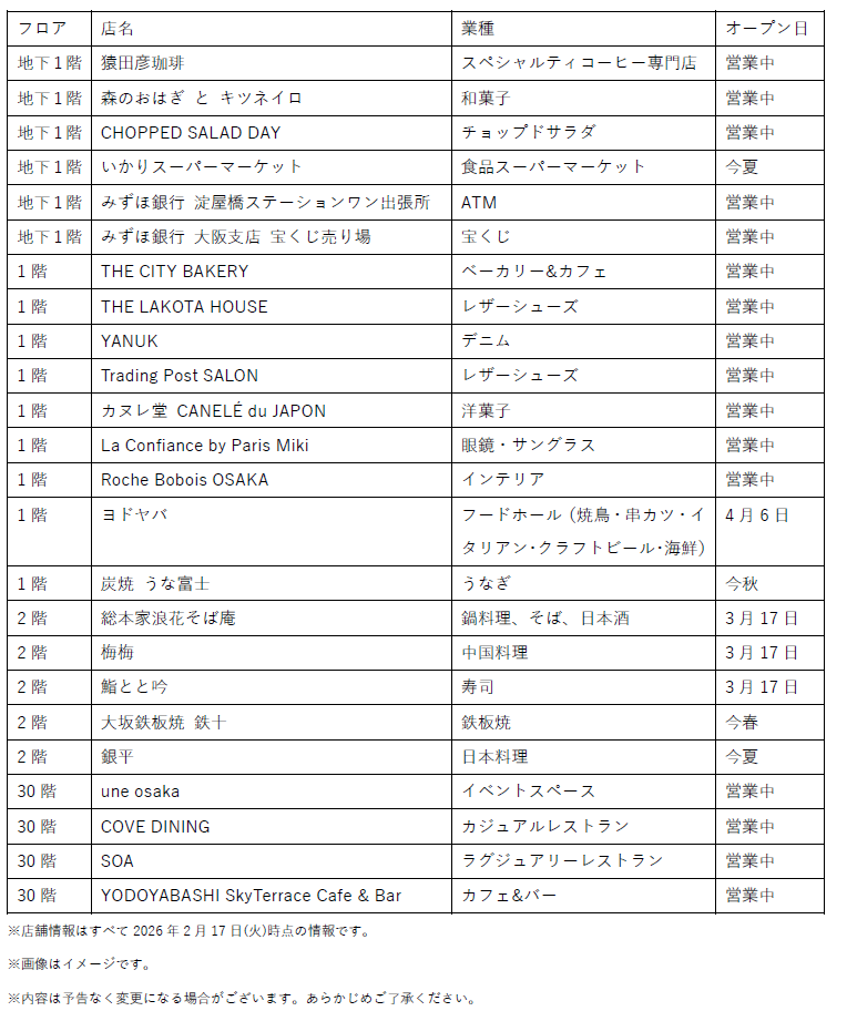 2026.02.17中央日本土地建物株式会社(千代田区霞が関一丁目 代表取締役社長 三宅 潔)と京阪ホールディングス株式会社(大阪市中央区大手前一丁目 代表取締役社長 平川 良浩)は、株式会社みずほ銀行(千代田区大手町一丁目 取締役頭取 加藤 勝彦)と共同で開発した複合施設「淀屋橋ステーションワン」の商業ゾーンにおいて、待望のレストランフロアをはじめ、新業態や京阪沿線初出店を含む飲食・食物販8店舗が3月17日(火)より秋にかけて順次オープンすることを決定しましたのでお知らせします。本リリース記載の8店舗のオープンをもって、段階的に開業してまいりました全24店舗が出揃います。様々なジャンルのレストランやカフェ、スーパーマーケット等が揃うことで、「食」を中心とした多彩な楽しみ方ができる施設へと進化します。なお、商業ゾーンの運営会社は株式会社京阪流通システムズ(大阪市中央区天満橋京町1番1号 代表取締役社長 松下 靖)です。