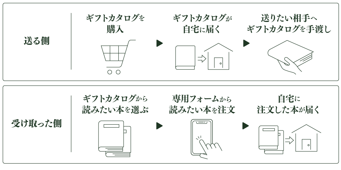 贈り手がカタログを渡し、受け手が専用サイトにて本を注文すると、本が自宅に届くサービスです。
