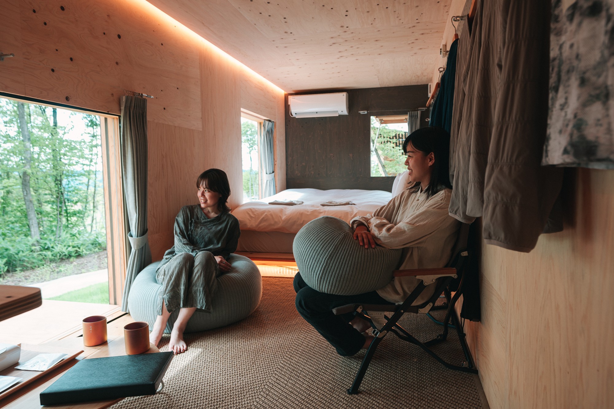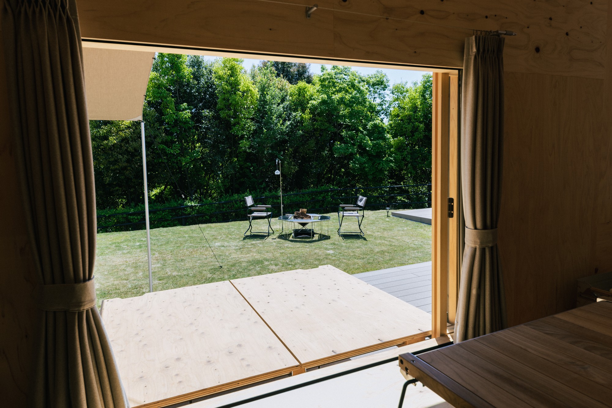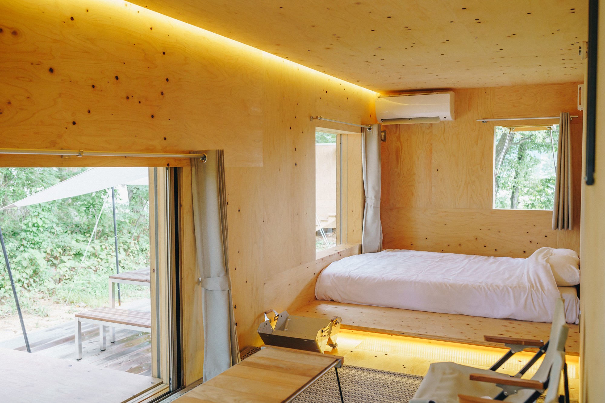 冷暖房を完備した快適な室内空間により、季節を問わず安心して滞在いただけます。併設された広々としたプライベートデッキは、自然ととけ合うような開放感あふれる空間。電源設備も整っており、スマートフォンの充電なども快適にご利用いただけます。