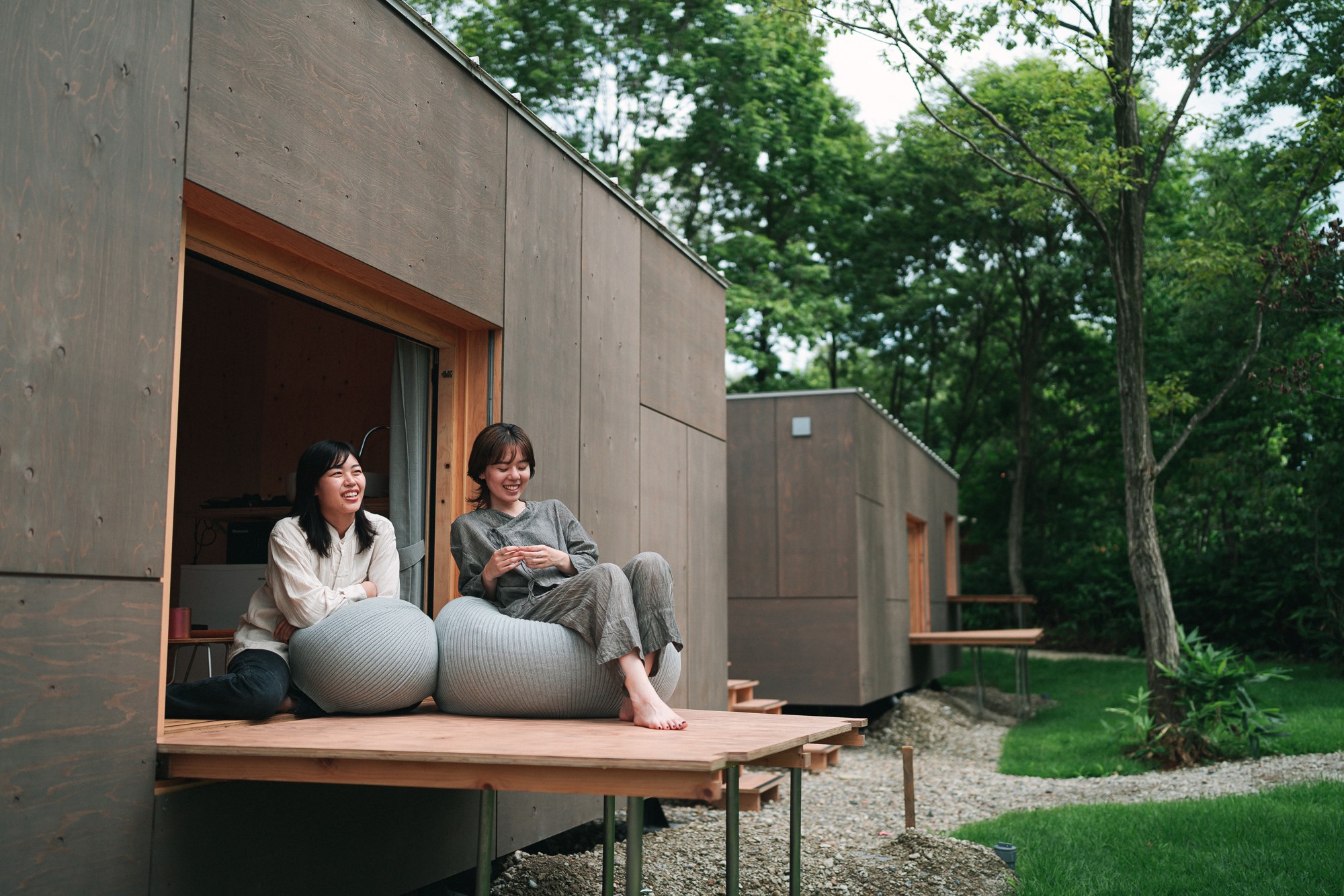 従来のテントから、建築家・隈研吾氏とスノーピークSnow Peakが共同開発したモバイルハウス「住箱-JYUBAKO-」へアップグレード。厳選されたスノーピークSnow Peak製品に囲まれ、木の温もりと高い機能性が調和する、モダンな非日常の空間が広がります。