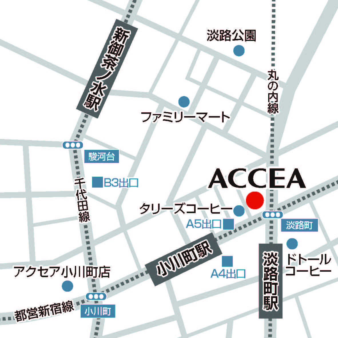 「アクセア淡路町店」は東京メトロ丸の内線淡路町駅A5出口よりすぐの好立地にオープンいたします。