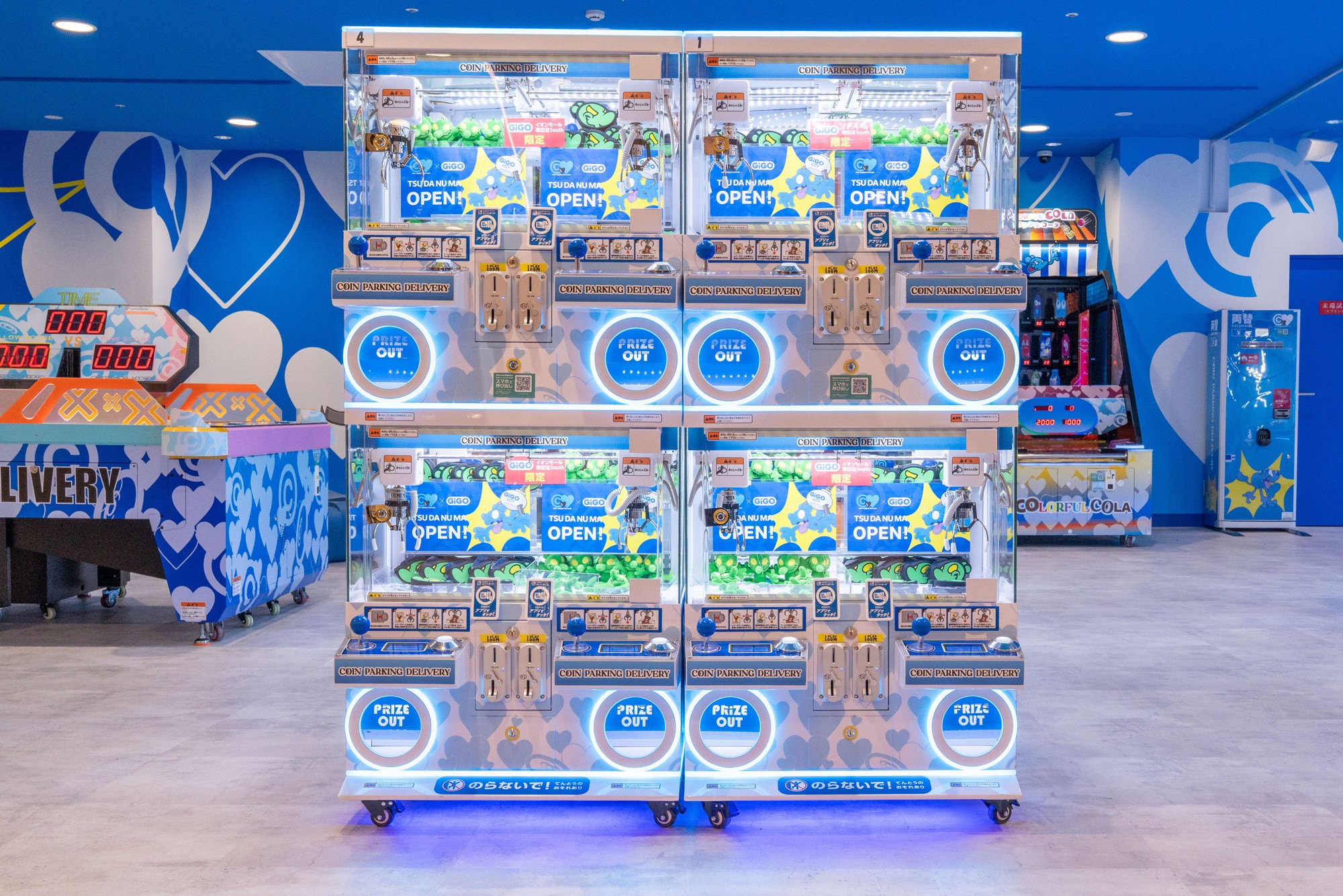 ポップでかわいらしいキャラクター表現の中に、不安や孤独、違和感といった現代的な感情を織り込み、Z世代から絶大な支持を集める覆面現代アーティスト「COIN PARKING DELIVERY」。そんな「CPD」とGiGOがタッグを組み、「GiGOイオンモール津田沼South」に新感覚のアミューズメント空間をつくり上げました。「CPD」が全ての世界観を構築し、内装やゲーム機のデザインを直接手がけています。