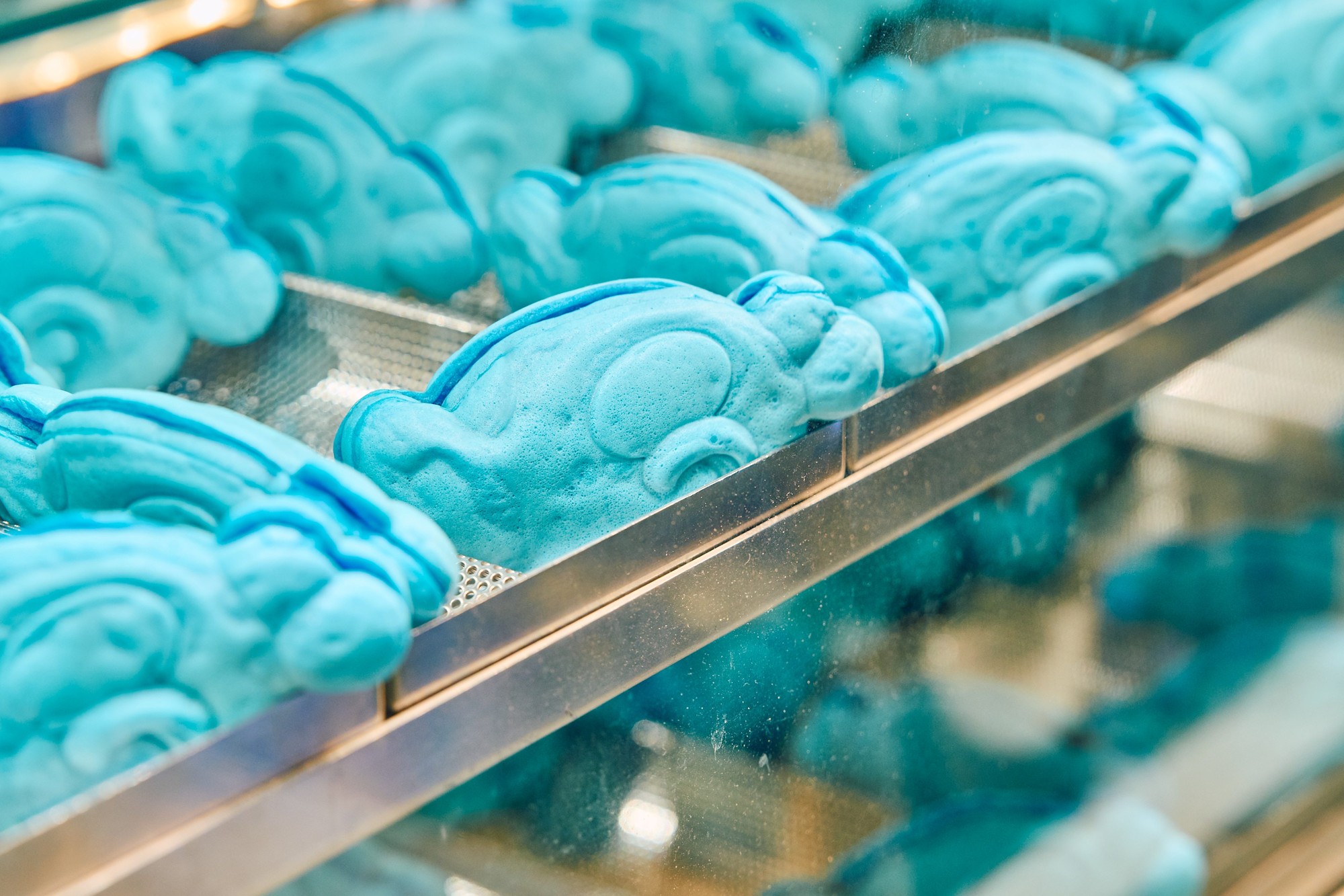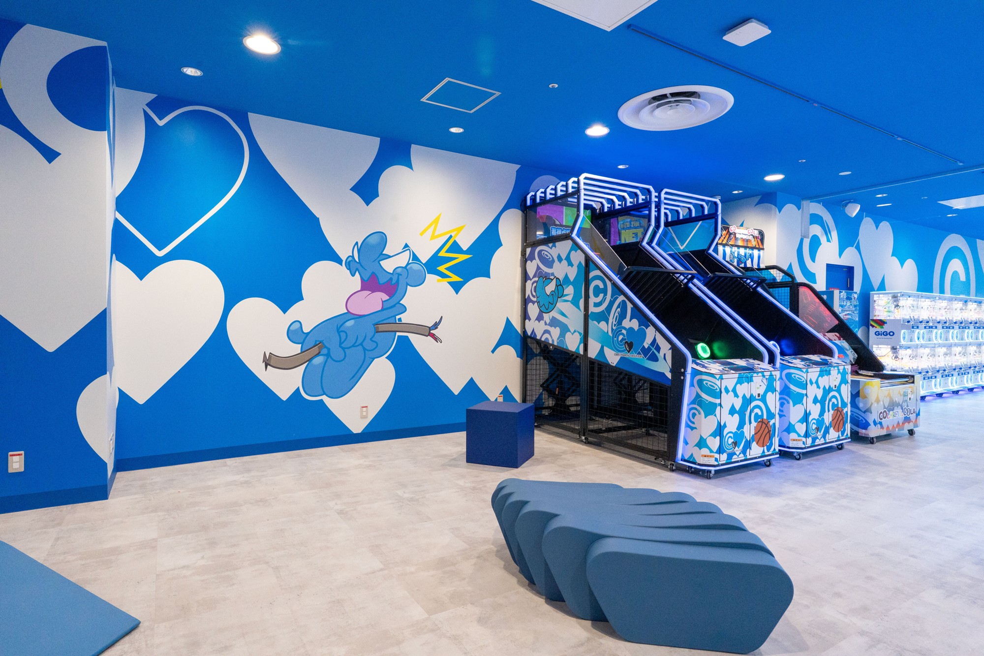 店内は「CPD」のメインキャラクター「白井さん」を軸にハートやモノグラム表現が展開され、ところどころに立体アートオブジェも登場。「CPD」デザインのクレーンゲームやバスケットボールゲームなどに加えて、「GiGOのたい焼き」の店舗デザインも「CPD」による特別仕様です。ここでは通常のたい焼きに加えて「CPD」のキャラクター「白井さん」をモチーフにした“青い”たい焼き「コインパーキングデリバリーコラボ焼き」も販売します。