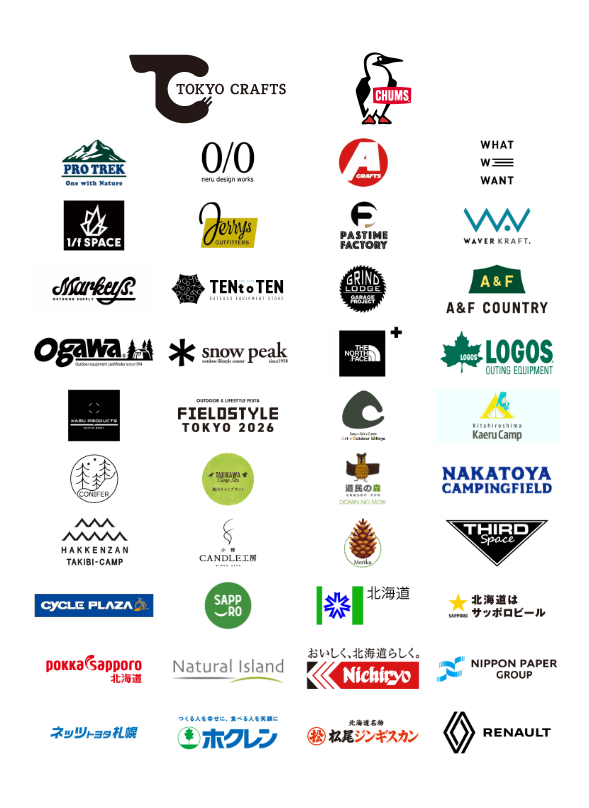 TOKYO CRAFTS、CHUMS、PRO TREK、0/0 neru design works、asimocrafts、WHAT WE WANT、1/f SPACE、JERRY’S OUTFITTERS、PASTIME FACTORY、WAVER KRAFT.、Markeys.outdoor supply、TENt o TEN、GRINDLODGE、KAMU PRODUCTS、FIELDSTYLE、A&Fカントリー、THE NORTH FACE、LOGOS、ogawa GRAND lodge、snow peak、ART×OUTDOOR VILLAGE 栗山、北広島かえるキャンプ場、遊び小屋コニファー、滝川キャンプサイト、北海道立道民の森、仲洞爺キャンプ場、八剣山ワイナリー焚き火キャンプ場、小樽CANDLE工房、杜育実行委員会、THIRD Space札幌、サイクルプラザ、札幌市環境局環境共生担当課、北海道野生動物対策課、サッポロビール、ポッカサッポロ北海道、ナチュラルアイランド、日糧製パン、日本製紙グループ、ネッツトヨタ札幌、ホクレン農業協同組合連合会、松尾ジンギスカン、ルノー札幌